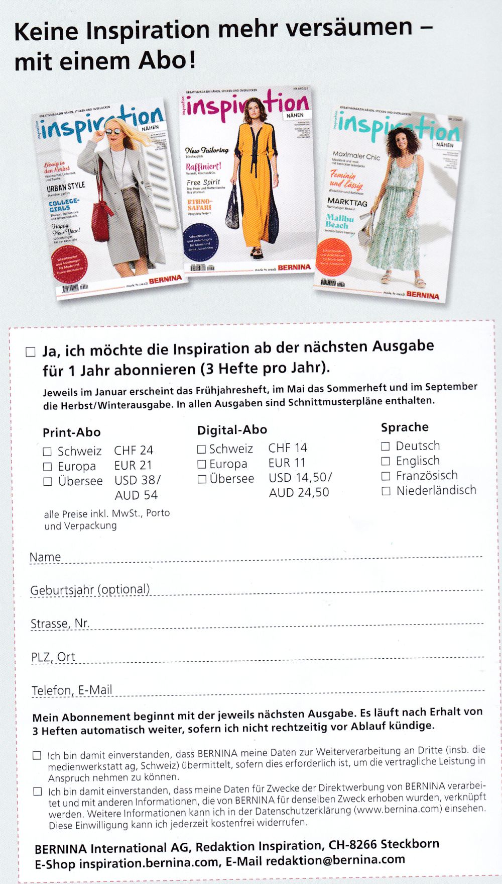 Lesenswert! Dazu solltet ihr dann die Ausgabe nutzen. Diese gibt es im Fachhandel - bspw. bei unserem Werbepartner. BERNINA freut sich aber auch immer über neue Abonnenten.