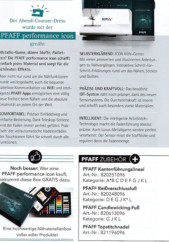 Das Titelbild hat mich sehr angesprochen. Das ist Leonie Koch und im ausführlichen Interview mit ihr kann man lesen, dass sie selbst gern näht. In Zusammenarbeit mit Inge Szoltysik-Sparrer entstand das Titelmodell. Genäht mit der PFAFF® performance icon wurden Metallic Garne und Pailletten auf dünnem Stoff verarbeitet. Die Kombination - Anregung und Angebot vom Hersteller sieht dann so aus. (Klick aufs Bild für bessere Sicht bei Interesse).