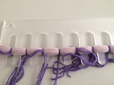 Der Kunststoff ist nicht rutschig, so dass die Wolle auch da bleibt wo man sie hinwickeln will. Danach ist es sicher ratsam, dass man sich direkt die Abbindefäden zurecht schneidet und bereit legt. Beim kleinen Pompon benötigt man dazu 9 Stück. Je nachdem was man damit weiter machen möchte, sollte der Faden länger oder kürzer sein.