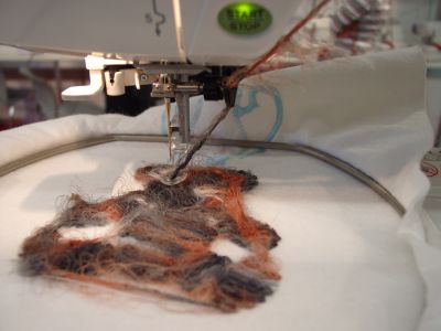 Mit dem normalen Stickfaden wird die Wolle mitgeführt. Der Nadelfaden zieht quasi die Wolle von daaaaaaaaaaa (oben) ab.