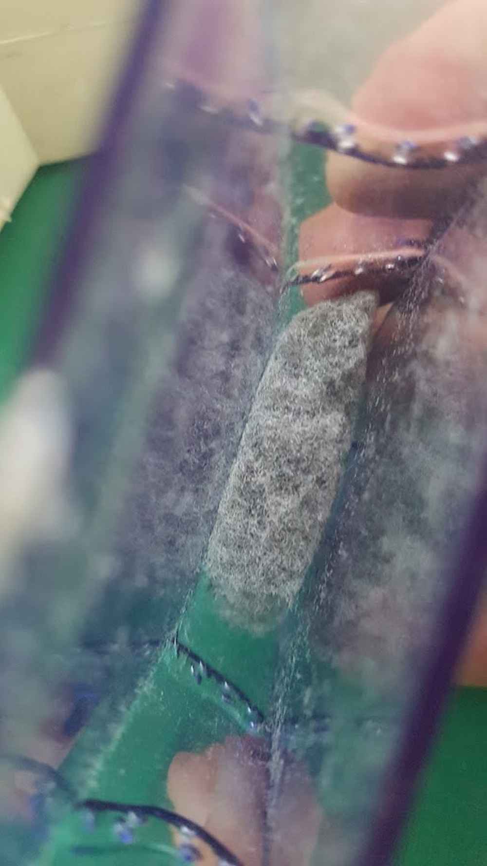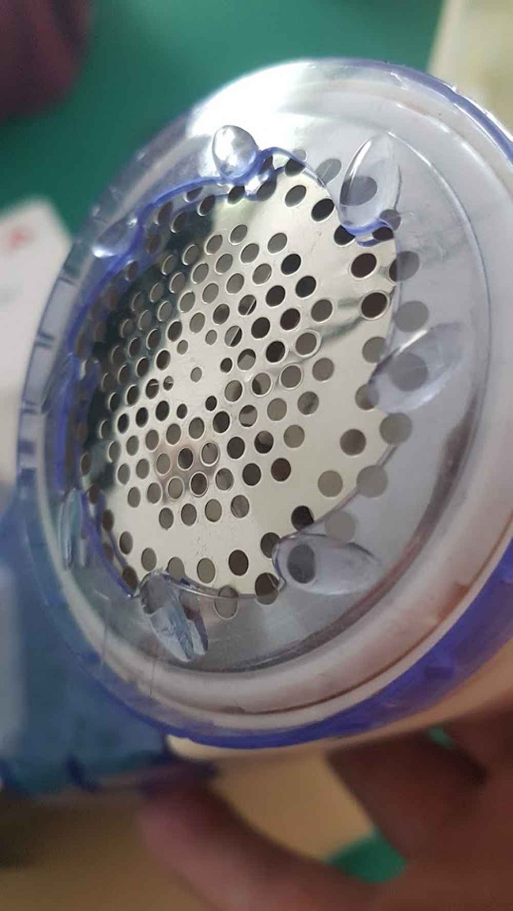 Und los gehts. Erstaunlich, wie schnell und leicht im Gegensatz zu den in unserem Haushalt in diverser Anzahl vorhandenen Fuselrasierern (batteriebetrieben) auch große Flächen "abgrast". Eine Testjacke war nach unter einer Minute von Fusseln befreit. Das ist schon mal ein enormer Zeitvorteil gegenüber den herkömmlichen Geräten. Wie ihr seht, wurde der "kleingehäckselte" Stoff im leicht abzunehmenden Auffangbehälter gesammelt: