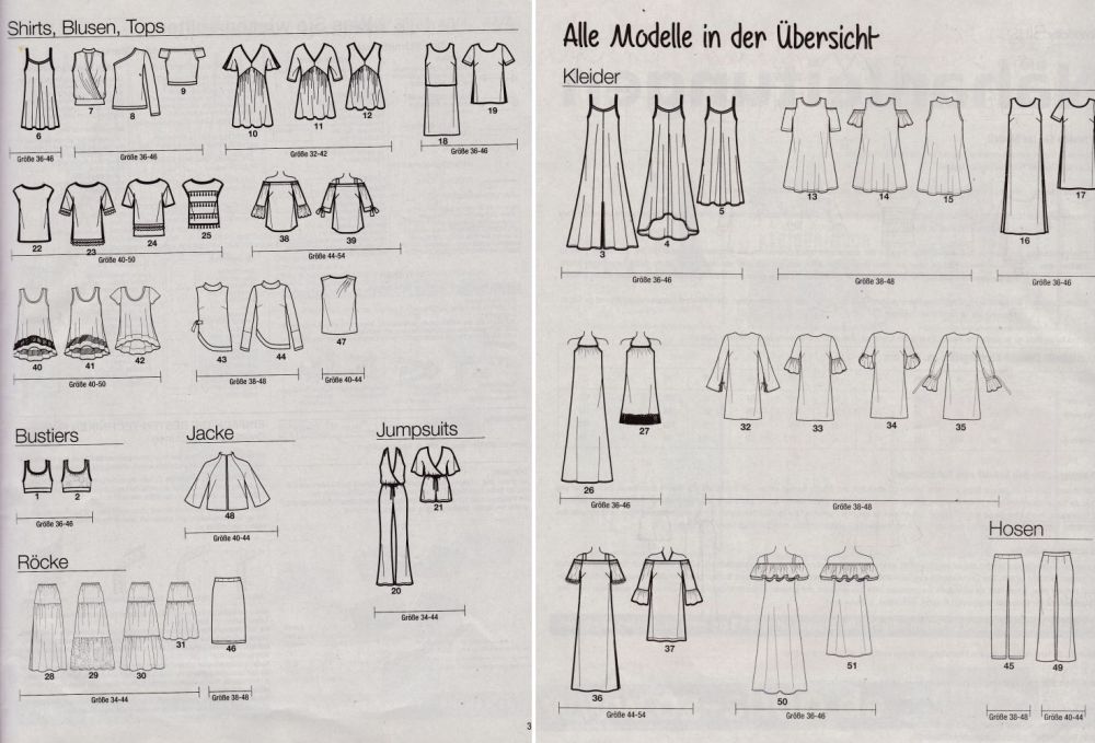 Die angegebenen Größen 34 bis 54 werden natürlich wie immer nicht für alle Modelle angeboten und auch nicht alle Schnittmuster aus dem Originalangebot
