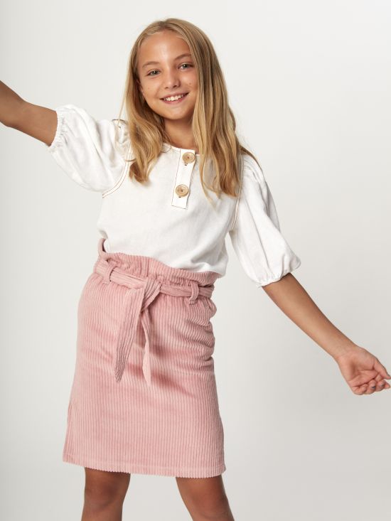Wenn die Zeit knapp, aber die Lust zum Nähen für den Nachwuchs groß ist, empfehlen wir den lässigen Cordrock. Er besteht aus nur drei Schnittteilen plus vier Gürtelschlaufen und kommt ganz ohne Reißverschlüsse und Knöpfe aus. Dadurch ist der Rock wirklich leicht und extrem schnell zu nähen.