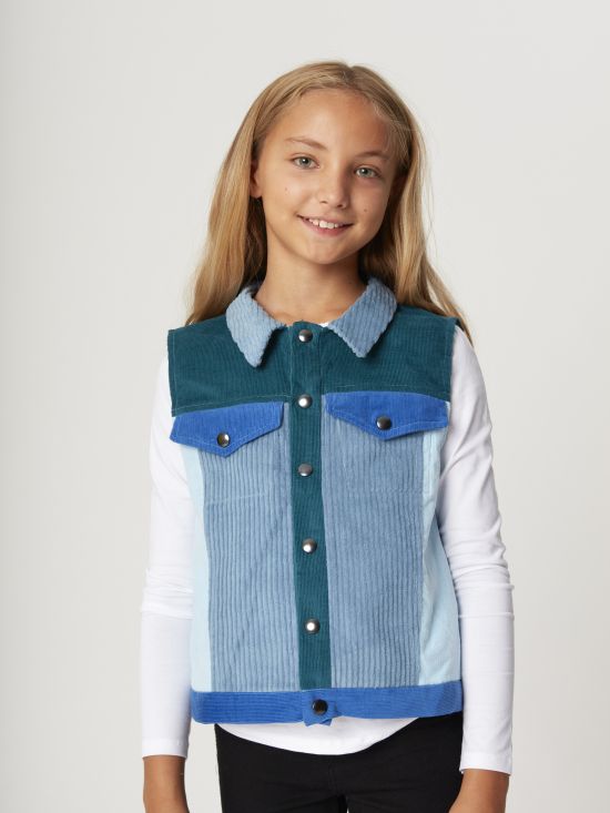 Im Stoffregal lagern noch ein paar größere Reststücke Cord? Hier kommt die Chance auf den großen Auftritt: Die Weste im Retro-Look besticht mit tollen Details und der geschickten Kombination unterschiedlicher Farbtöne. Die Weste kann in den Größen 98, 110, 122 und 134 genäht werden.