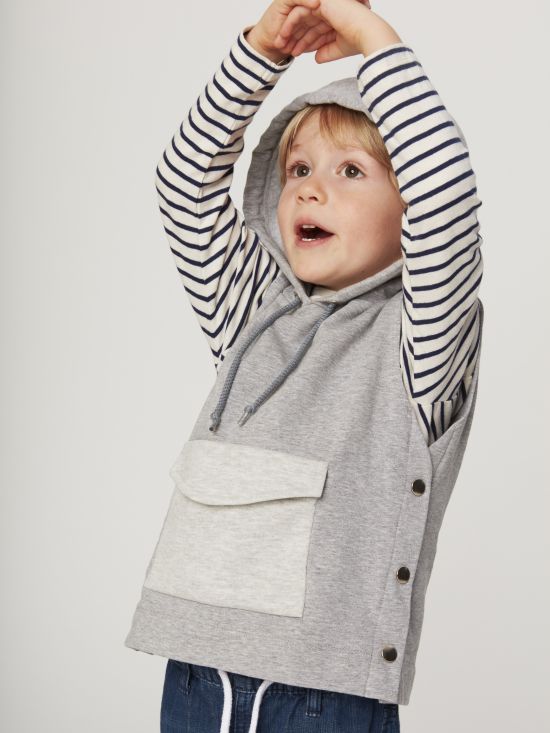 Hoodie mal anders: Das Kapuzenshirt hat keine Ärmel, dafür aber statt Seitennähten markante Druckknopfverschlüsse und eine große Tasche auf dem Vorderteil. Das Schnittmuster für den ausgefallenen Hoodie für Mädchen und Jungen gibt es in den Größen 98, 110, 122 sowie in 134.