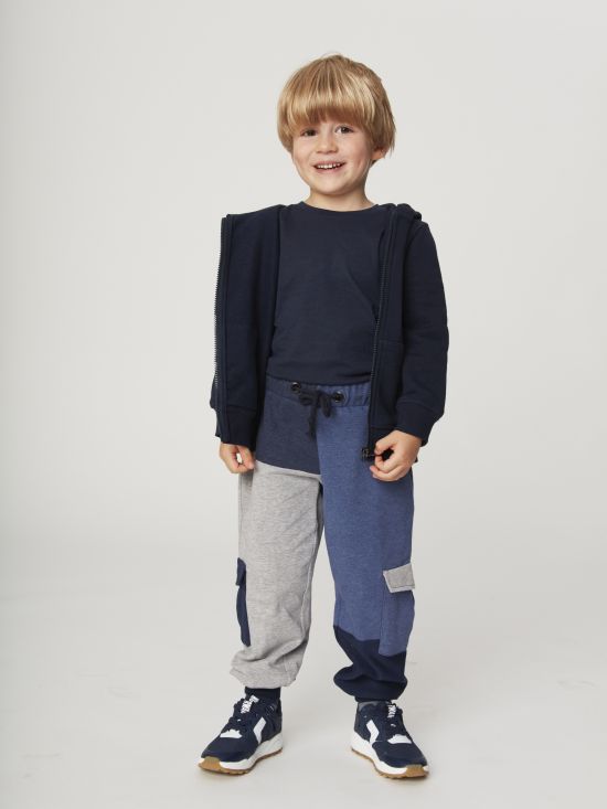 Total bequem und herrlich entspannt: Jogginghosen lieben Kinder (und Erwachsene) nicht nur beim Sport. Dieses Exemplar bekommt seinen individuellen Look durch den Mix von Sweatstoff in verschiedenen Blau- und Grautönen. Trotz dieses “Patchworks” ist die Hose schnell und einfach genäht.