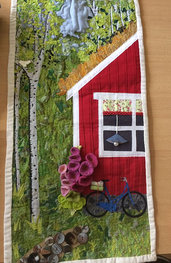 Der Schwedenhaus, das in der gleichen Technik entstanden ist, habe ich gemacht aus der Lieferung einer der Stoff-Briefe der deutschen Patchwork Gilde. Dabei mache ich schon viele Jahre mit. Es gibt ein Thema und wenn man daran Interesse hat, meldet man sich an und bekommt dann einen Brief mit Material . Beim Schwedenhaus waren es Stoffstücke und drei Knöpfe, von denen Einer die Filzblüte war.