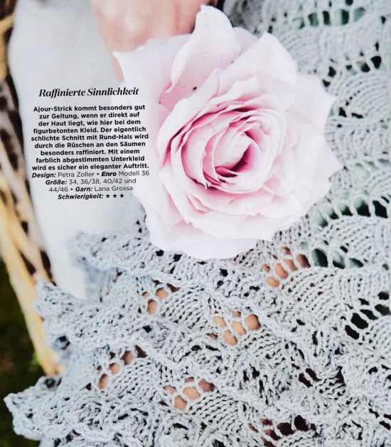 Das Titelmodell hat einen sehr tiefen Ausschnitt und ist somit immer mit einem Shirt oder Top darunter zu tragen. Den Ajourpullover kann man dann sehr gut auch mit vielen Farben kombinieren. Dass er im Original grau ist, habe ich erst beim Lesen der Arbeitsanleitung richtig wahr genommen.