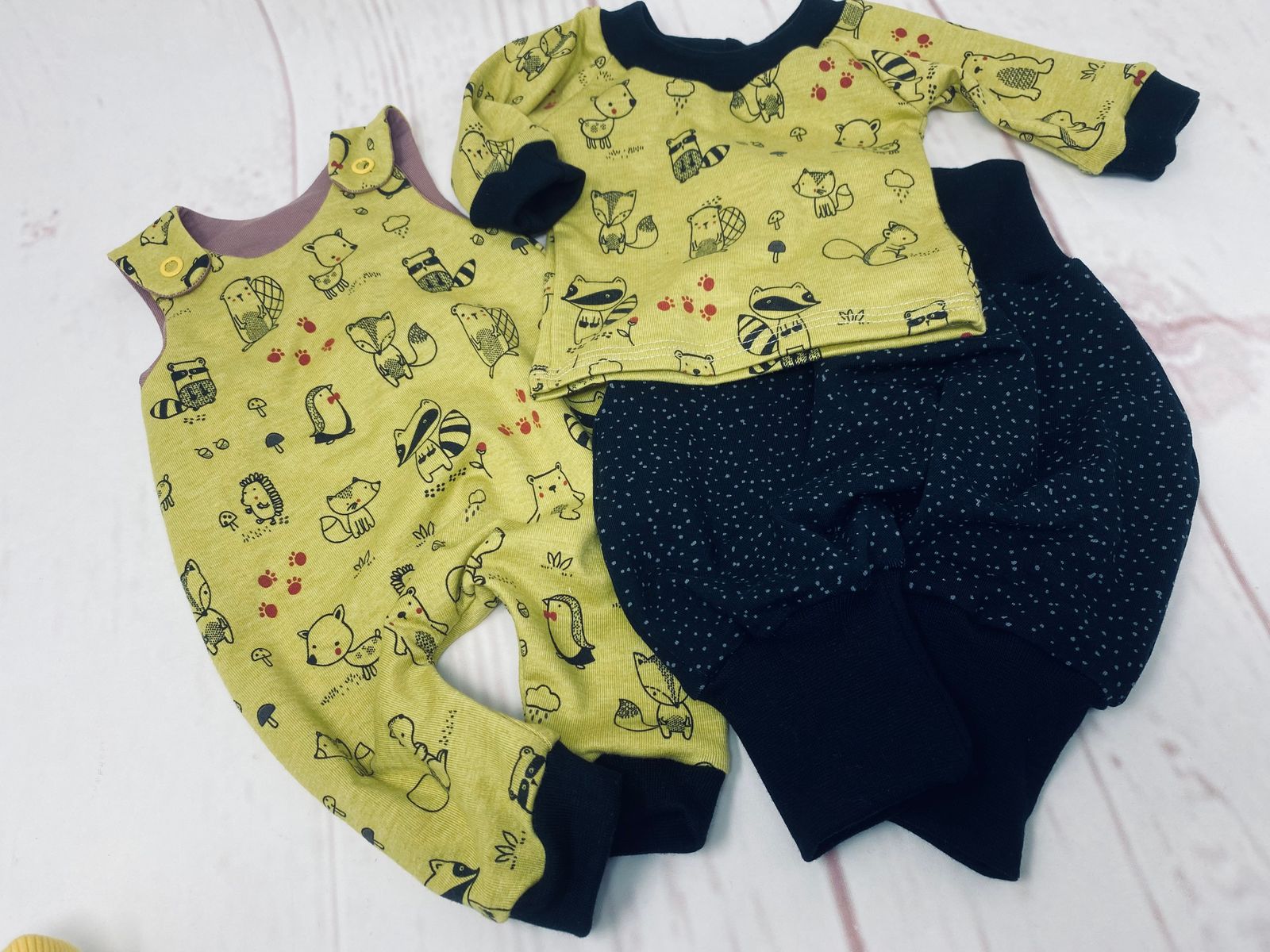 Hier die Bilder der einzelnen Sets. Teilweise habe ich wirklich aus den kleinsten Resten noch ein Teil zuschneiden können und mit ein bisschen Organisation und Kombination sind doch ganz hübsche Sets und Strampler zusammengekommen. Teilweise auch wieder für Zwillinge.