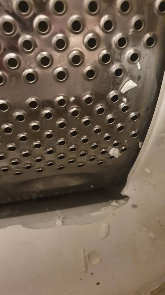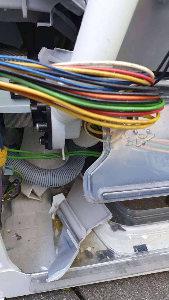 Statt der Klappen zum Entnehmen der Wäsche war die Trommel samt einiger Plastikteile zu sehen, auffällig war ein großer, herausgebrochener Teil des Kunststoffes (unten im Bild). Und nö, das ist kein Dreck, das sind Schatten. ![]()