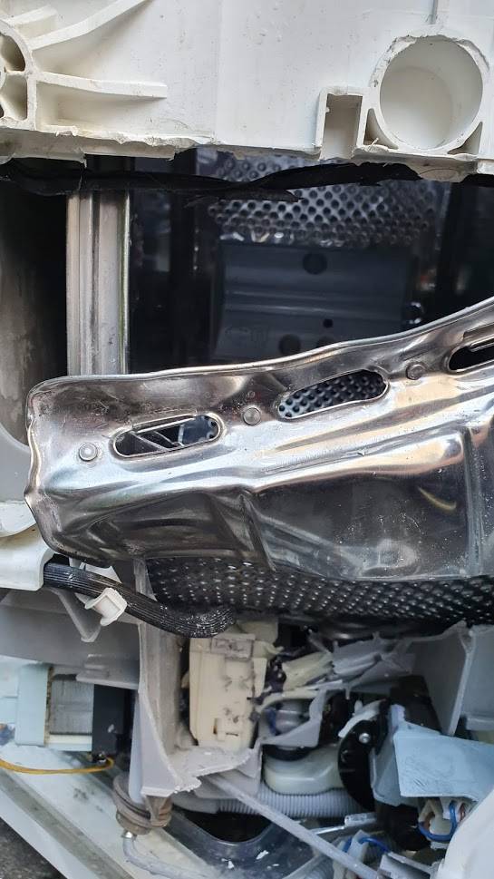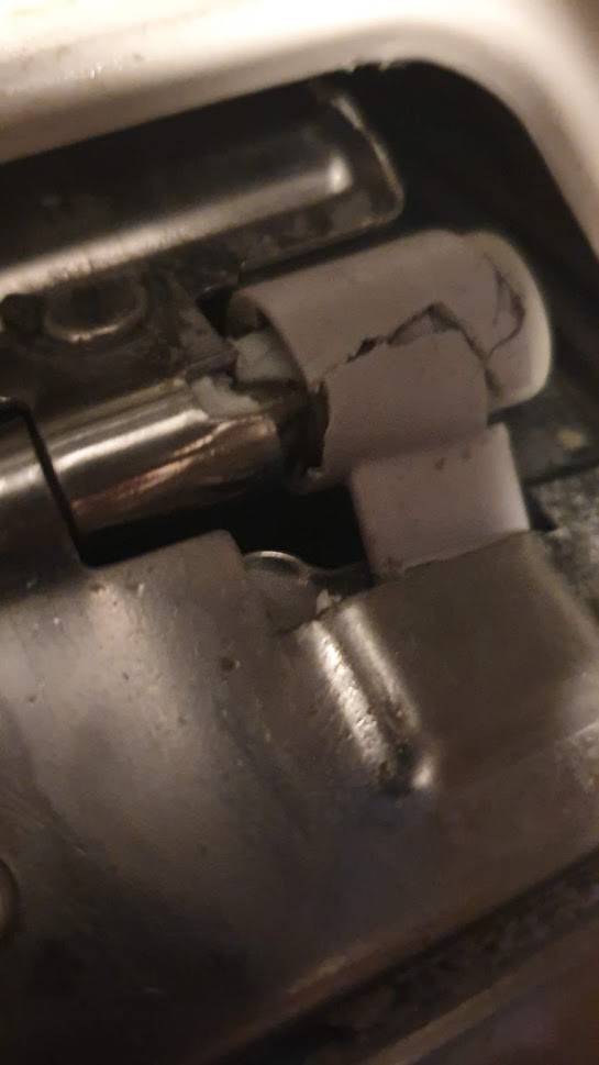 Der Deckel der Trommel war im hinteren Teil der Maschine verschwunden. Dafür demonstrierte das Scharnier des Deckels auffällig seine Einstellung, ab sofort nicht mehr mit dem Rest des Gerätes zusammen arbeiten zu wollen: