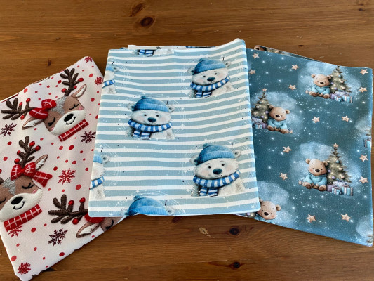 Pünktlich zum Start in die Weihnachtsvorbereitungen sind die ersten 3 bestellten Stoffe eingetroffen - jeweils ein halber Meter und zu den beiden rechten Stoffen habe ich auch noch ein passendes Bügelbild bestellt. Da möchte ich gerne noch passende Shirts dazu machen. Das wird bestimmt niedlich.