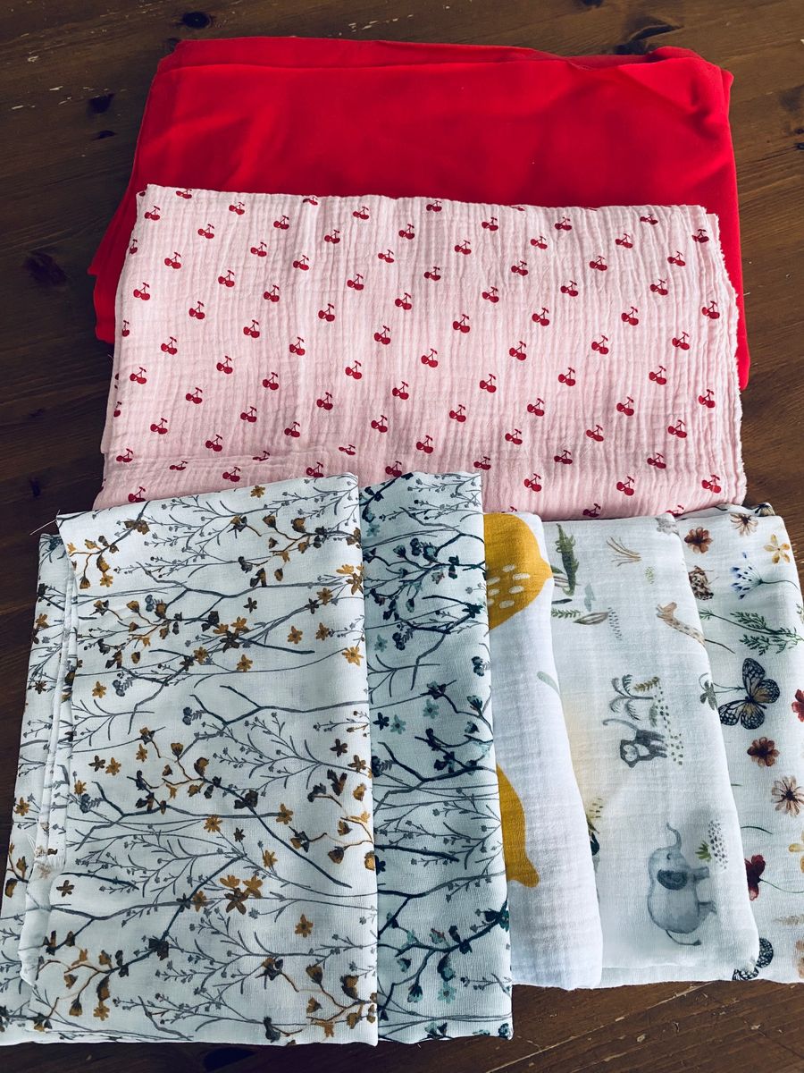 Der rote Sweat ganz oben ist für die Murmel, der Rest sind die bestellten Musselinstoffe.