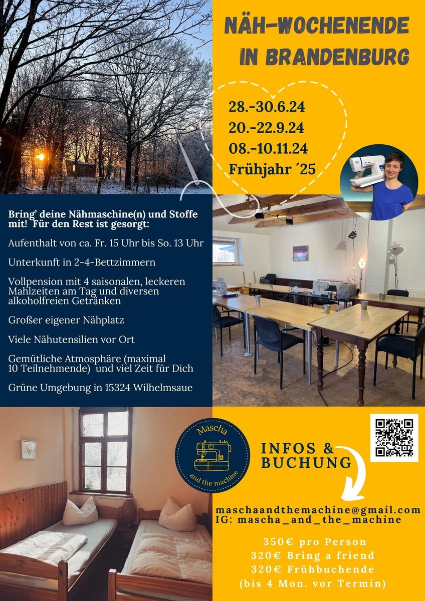 Ich organisiere 3-4x im Jahr Nähwochenenden im Oderbruch (Brandenburg) in gemütlicher Runde mit maximal 10 Teilnehmenden. Im Preis inklusive sind 2 Übernachtungen in 2-4-Bettzimmern, Vollpension mit 4 Mahlzeiten und alkoholfreien Getränken, eigenem Nähplatz, Nähutensilien, viel Zeit für dich und Austausch mit Gleichgesinnten! In grüner Umgebung in 15324 Wilhelmsaue.