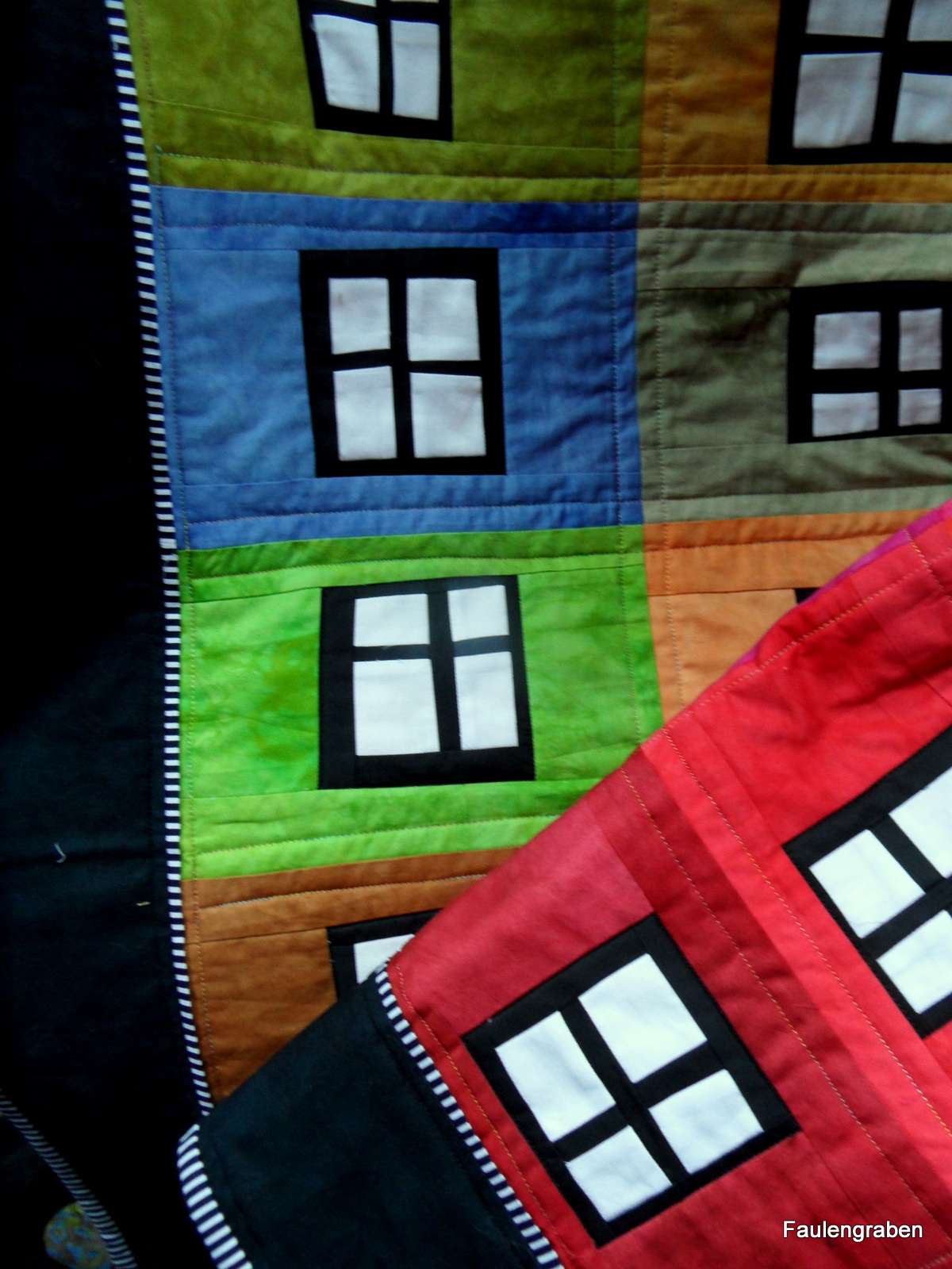 Zusätzlich sind die Fenster innen schwarz in der Naht abgesteppt - da mit ich da nicht auf den bunten Stoff rutsche habe ich darauf geachtet, dass die Nähte nach außen gebügelt sind.