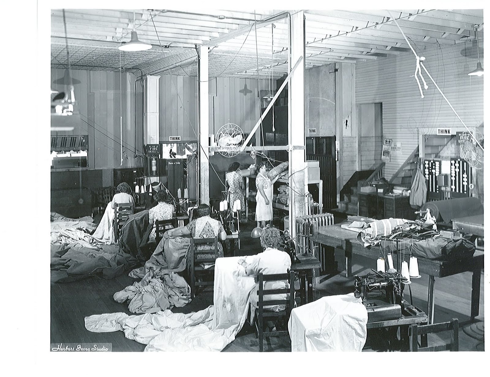 Historisches Foto des US-Armeeausrüsters Armbruster: Die Frauen sitzen an normalen Nähtischen: http://1.bp.blogspot.com/_-nAC…Armbruster+Plant+WWII.jpg