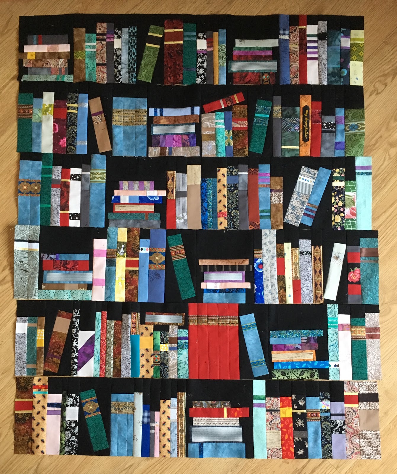 Das macht sicher Sinn, wenn man sich überlegt, ob man den Hintergrund überhaupt quilten muss. Mir ist aber klar, dass ich ihn quilten will, denn ich fände diese Linien kreuz und quer im Schwarzen einfach unschön. Ich verlinke einmal auf eines der Bilder von dem Bücherregal, das ich im Anfangsposting gezeigt habe.