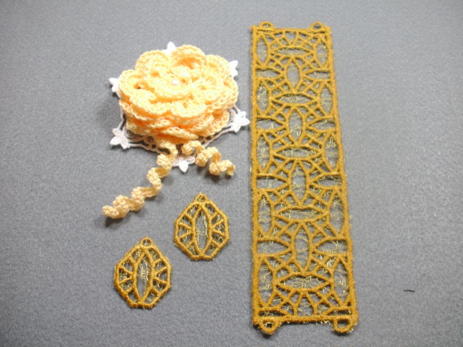 Armband und Ohrringe selbt entworfen und digitalisiert, gestickt auf der Artista 200, unterlegt mit einem goldfarbenen Dekostoff