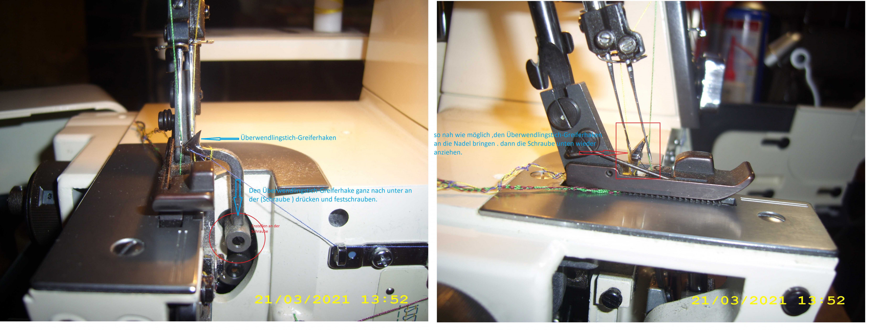 Das einstellen der Overlock Privileg 4000 so nah wie möglich ,den Überwendlingstich-Greiferhaken an die Nadel bringen . dann die Schraube wieder anziehen. Den Überwendlingstich-Greiferhake ganz nach unter an der (Schraube ) drücken und festschrauben.