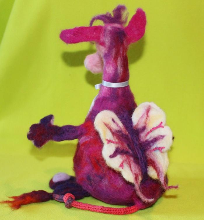 trägt Filzflügel, passend dazu eine kleine Satinschleife und hat ein Stricklieselschwänzchen mit Knoten und Filzquaste.