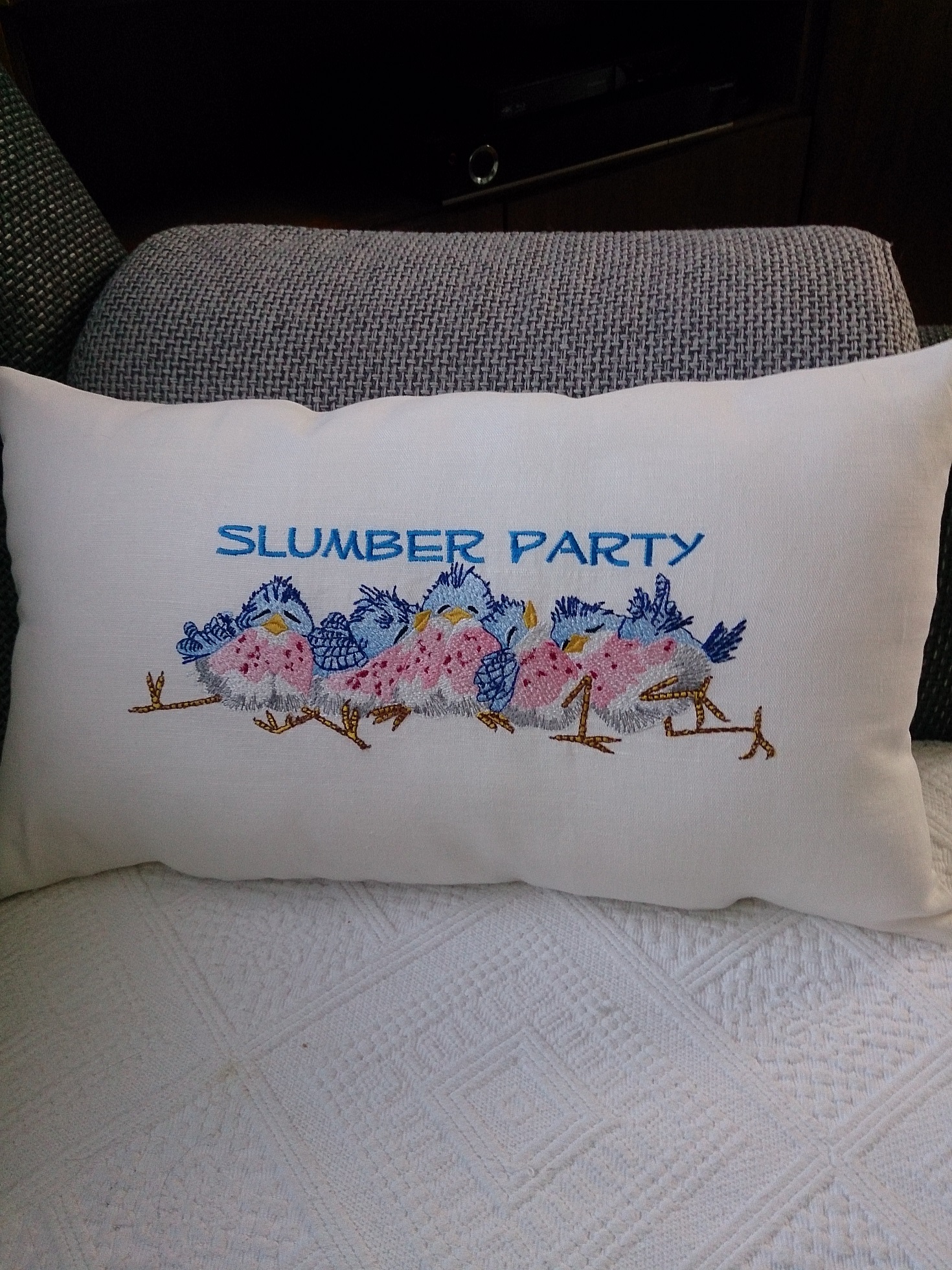 Die lustigen Vögel sind von bettys original embroideries. Ich habe davon schon einige Kissen, je nach Jahreszeit.