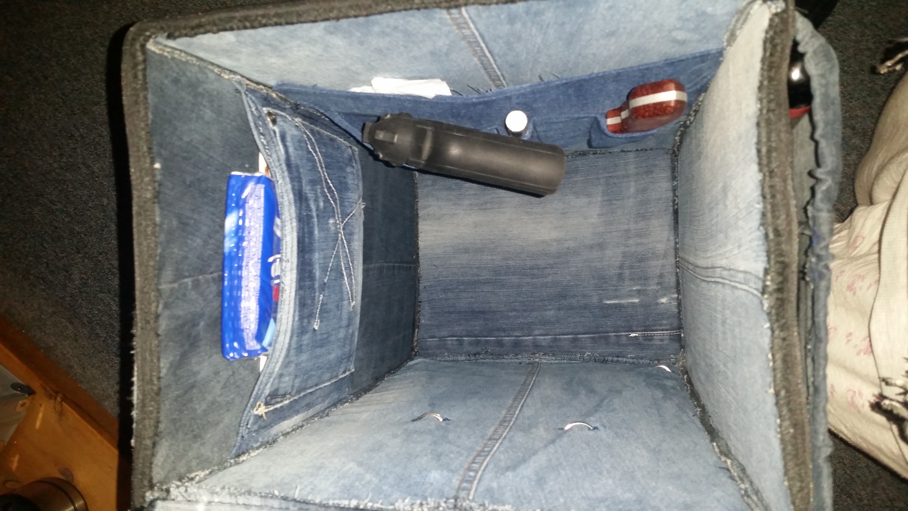 Der Rucksack von innen mit Taschen für das Trainings-Messer, die Pistole und das Kubotan sowie kleinere Fächer für Taschentücher etc.