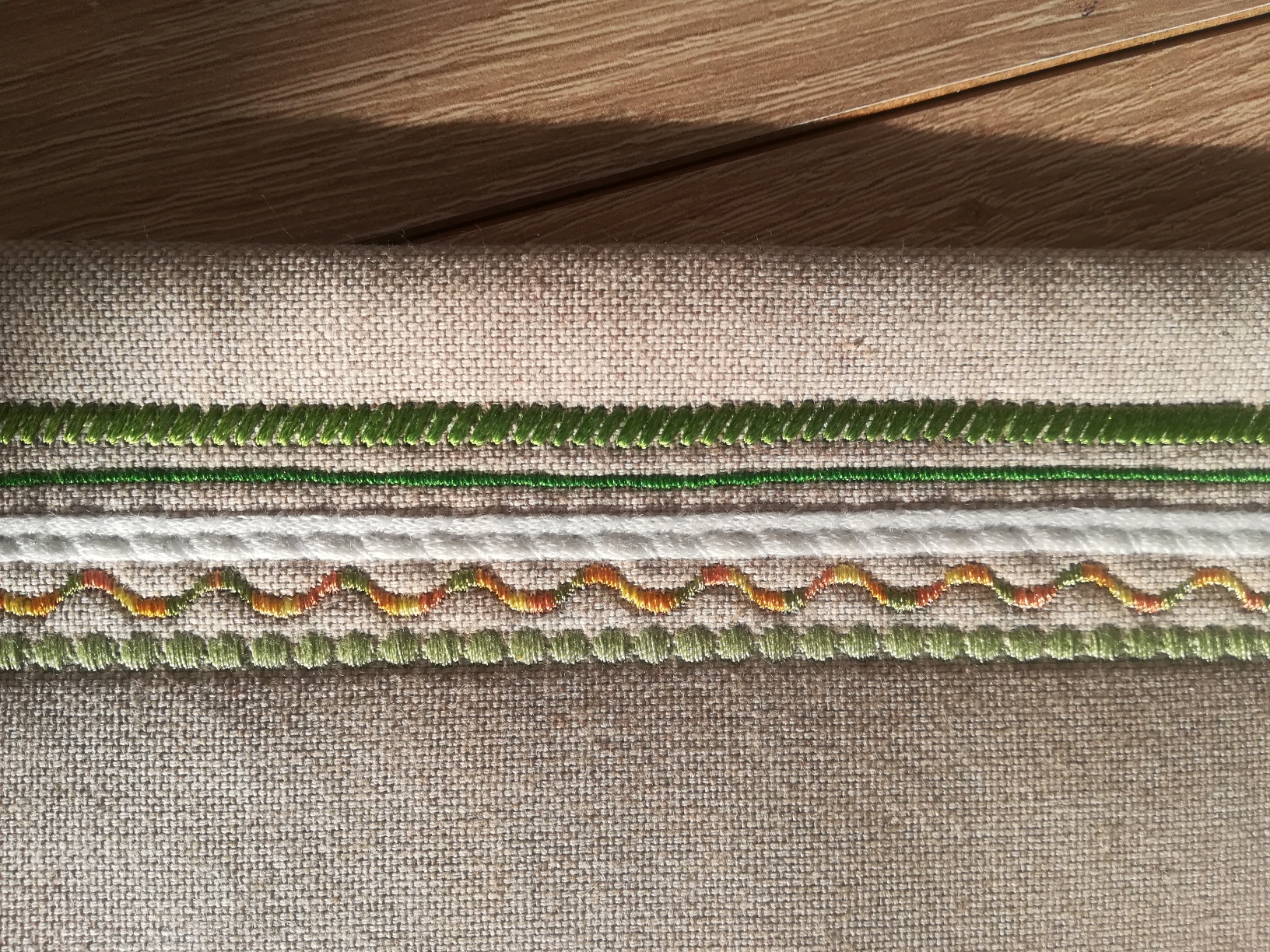 Hier habe ich verschiedene Zierstiche zu einer Bordüre kombiniert. Der weiße Streifen ist ein Bändchengarn mit dem Litzenfuß aufgenäht.