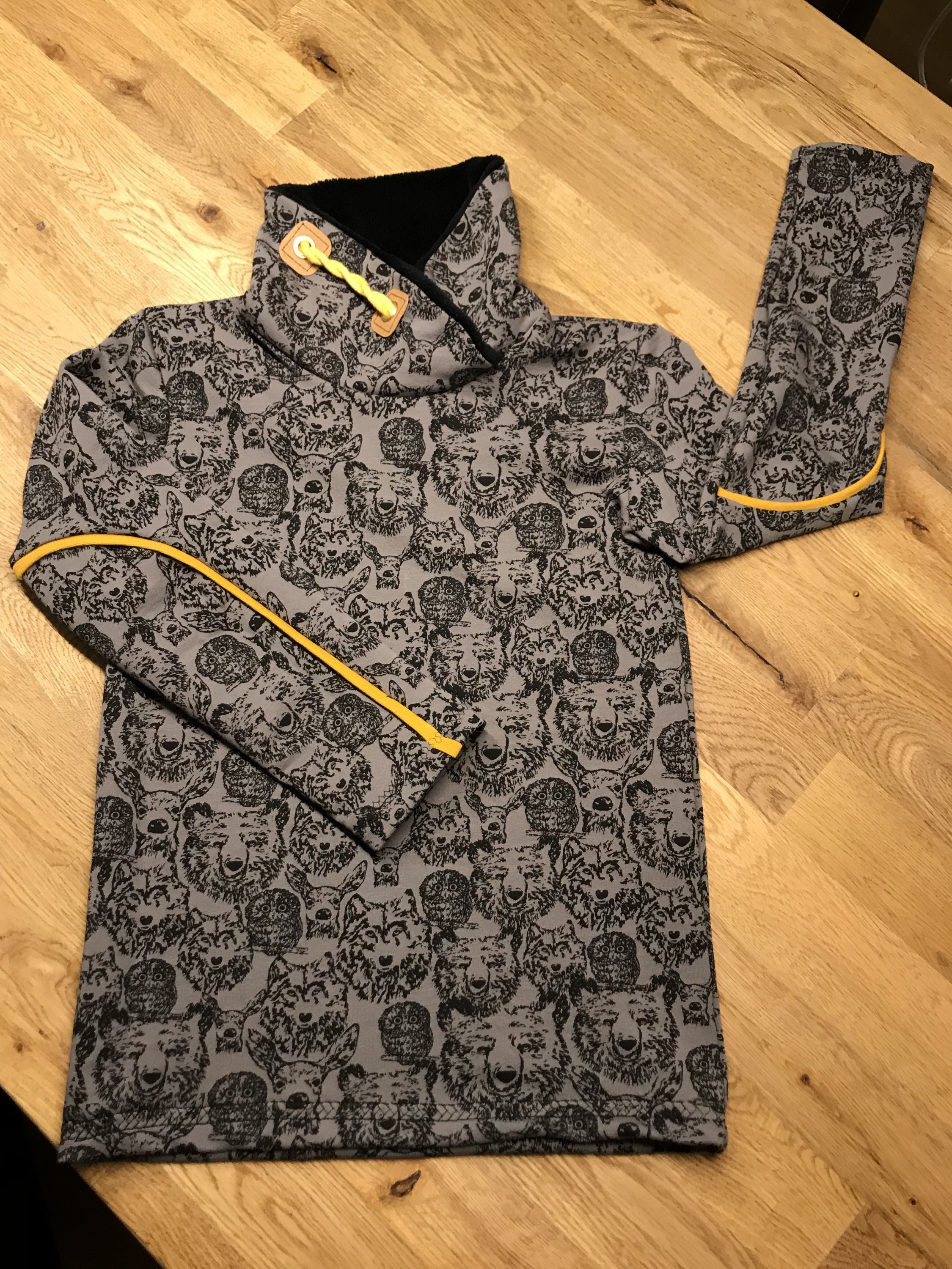Der letzte Meter Motivstoff wurde für meinen achtjährigen Sohn zu einem Pullover mit Kuschkragen vernäht. Kragen ist nach eigener Zeichnung entstanden und mit Fleece gefüttert.