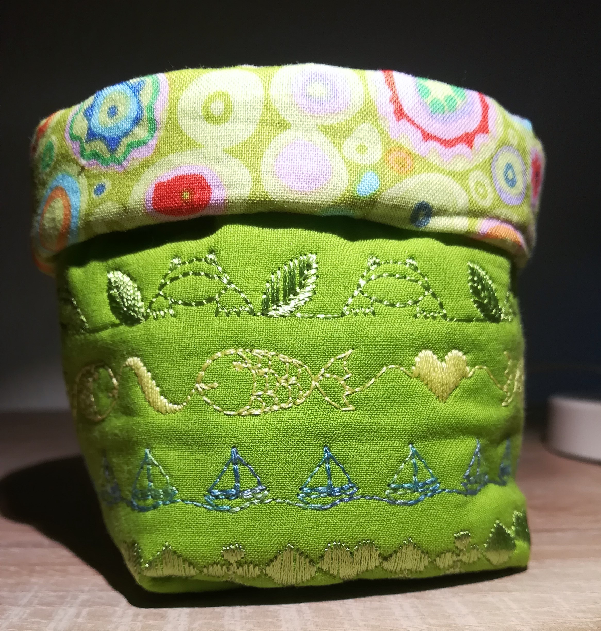 Die Idee, wiederverwendbare Abschminkpads zu nähen, fand ich klasse. Heute habe ich sie umgesetzt, und mir aus Stoffen in Muntermach-Farben welche mit passendem Körbchen genäht. Natürlich kamen dabei wieder meine geliebten Zierstiche zum Einsatz. Das Körbchen ist mit dünnem aufbügelbarem Volumenvlies verstärkt und gefüttert. Die Pads sind jeweils aus einer Seite Frottee und dünner Baumwollwebware. Hier kann man prima Reste verwerten. Genäht mit der Pfaff creativ 4.5