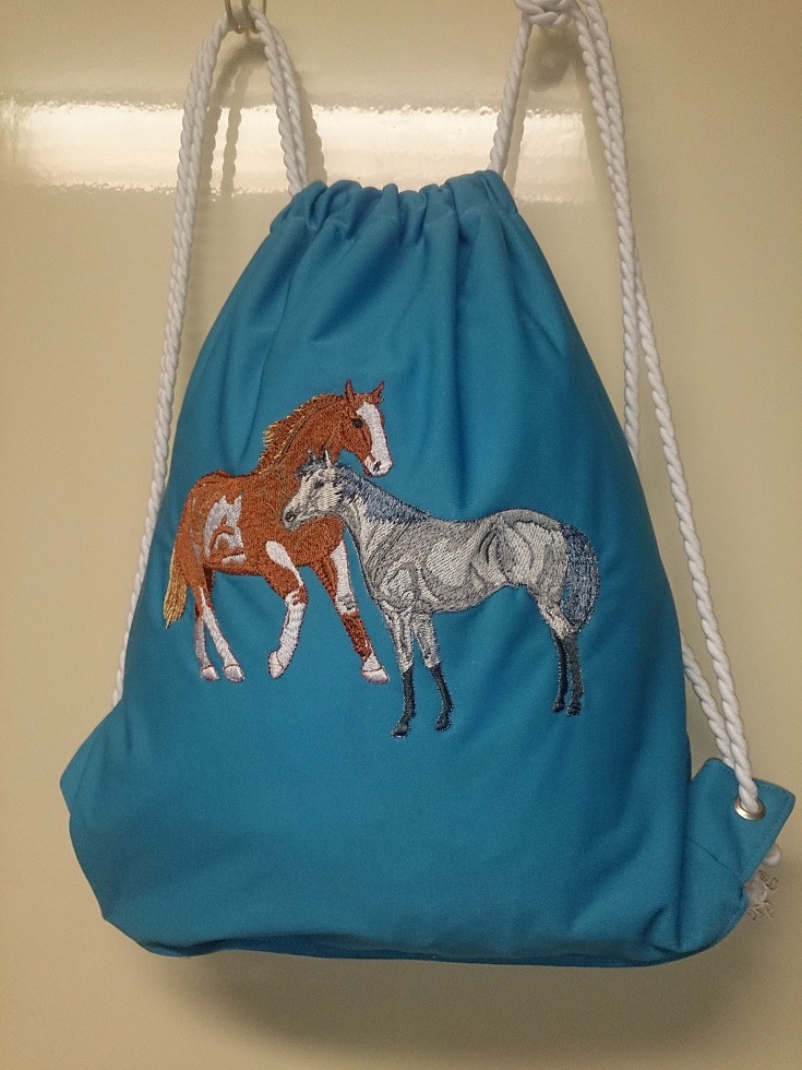Jetzt wohl so modern diese Beutel als Rucksäcke zu tragen. Nach dem Vorbildvon Sportherstellern nähte ich aus PUL Stoff kleinere Beutel und bestickte sie mit Pferdemotiven. Hier für meine Enkeltochter Neela.