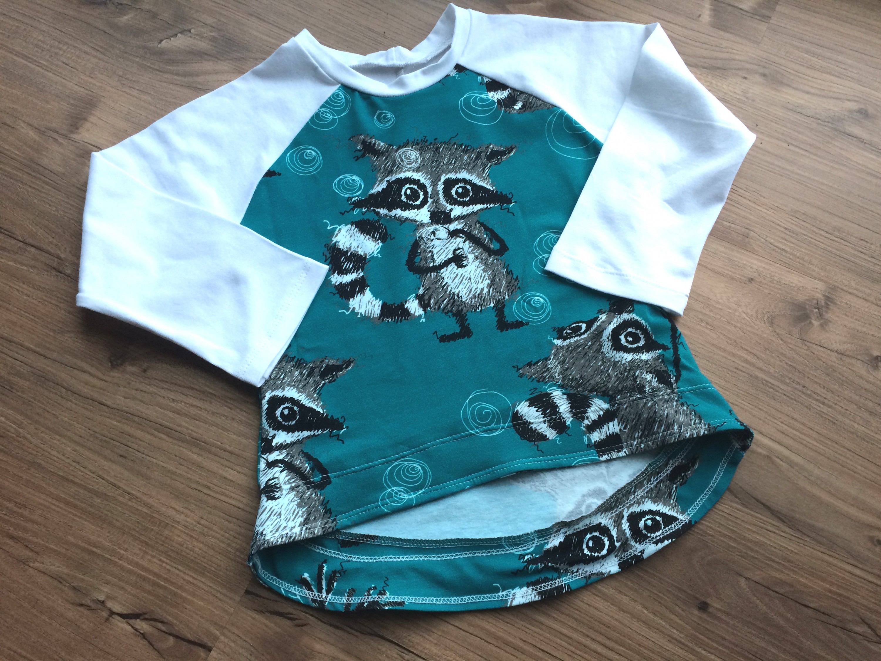 hier gibt es mal wieder ein "Unaussprechliches" für die Murmel. Sie liebt den Schnitt - Ebook Bethioua Mini von Elle Puls. Genäht habe ich Größe 98, die Murmel wächst. Kombiniert wieder weißen Jersey aus dem Vorrat mit dem tollen Print, gekauft mal über Michas Stoffecke. Wir haben diesen Stoff in vielen Farben, weil der Druck der kleinen Waschbären einfach zu süß ist.