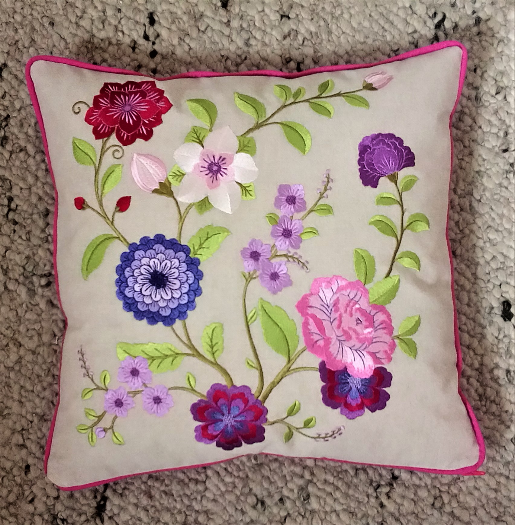 Ein Blumenkissen mit Madeira Rayon auf grobem Baumwollstoff mit der Pfaff creativ 4.5 im 35x36iger Rahmen gestickt. Dauert zwar lange, aber ich finde, es lohnt sich.
