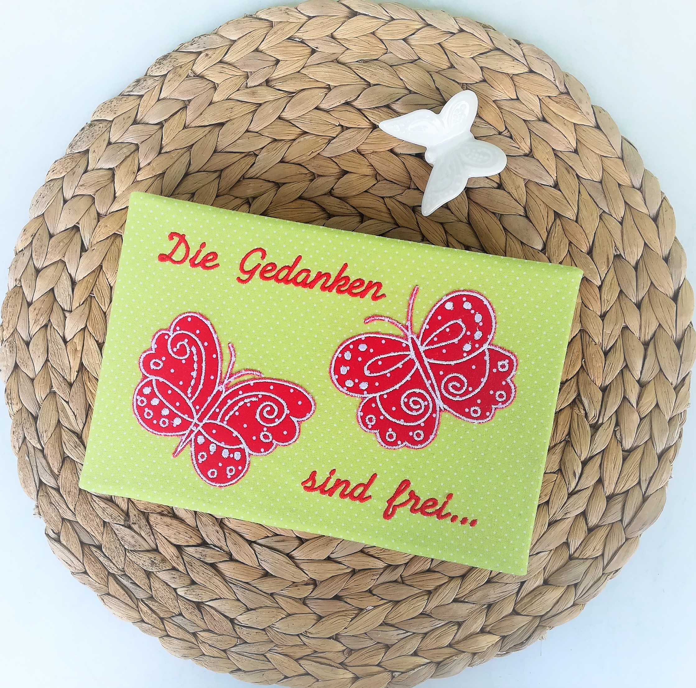 Als Probestickerin ist es ja immer reizvoll und eine Herausforderung mit dem Motiv etwas schönes zu kreieren. Hier bei den schönen filigranen Schmetterlingsmotiven war das sofort klar: