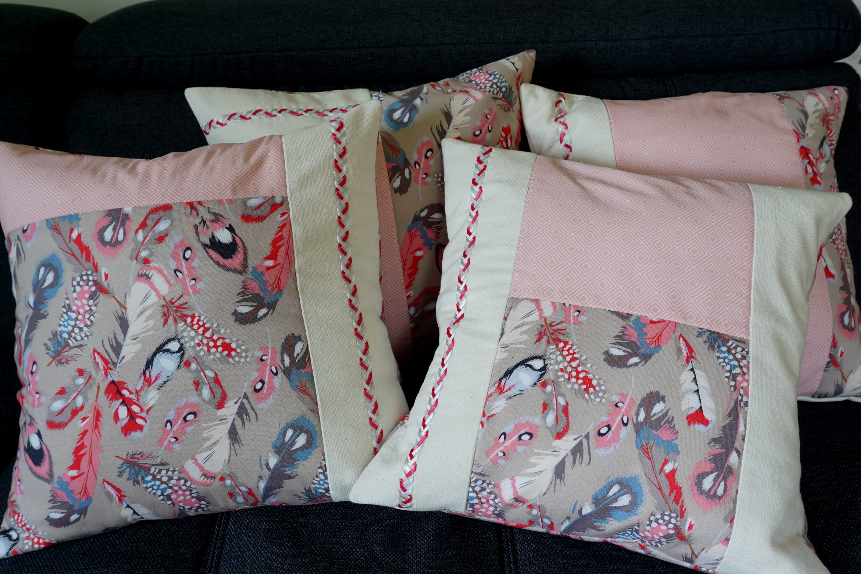 Neue Kissenhüllen. Federn: Gütermann. Karos: Stoffe-AG, beiger Stoff: war mal eine Hängematte.