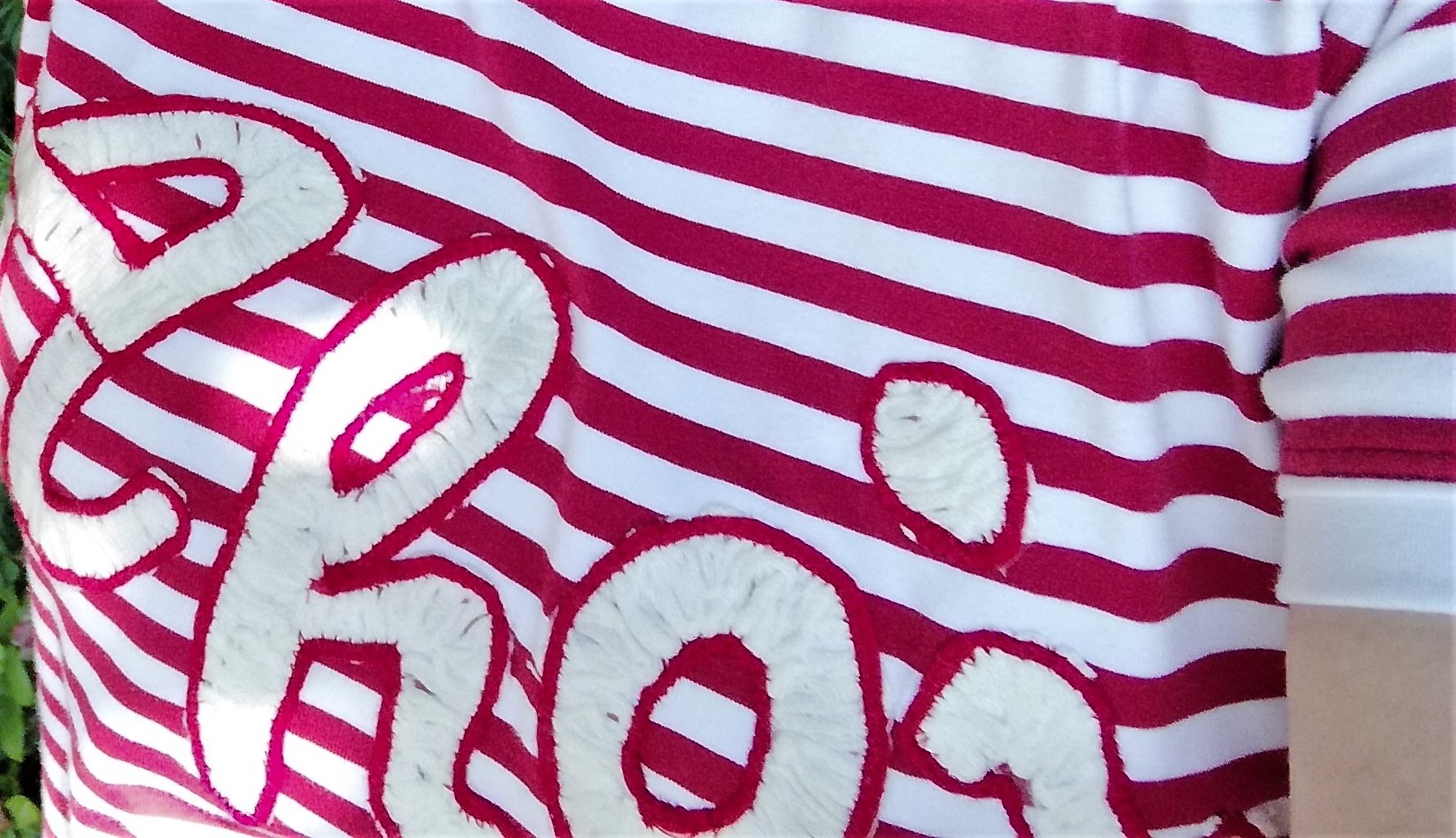 Das Shirt habe ich verziert mit einer Kordelstickerei. Mit meiner Pfaff creativ 4.5 und dem Kordelstickfuß auf der Nähmaschine erstellt.