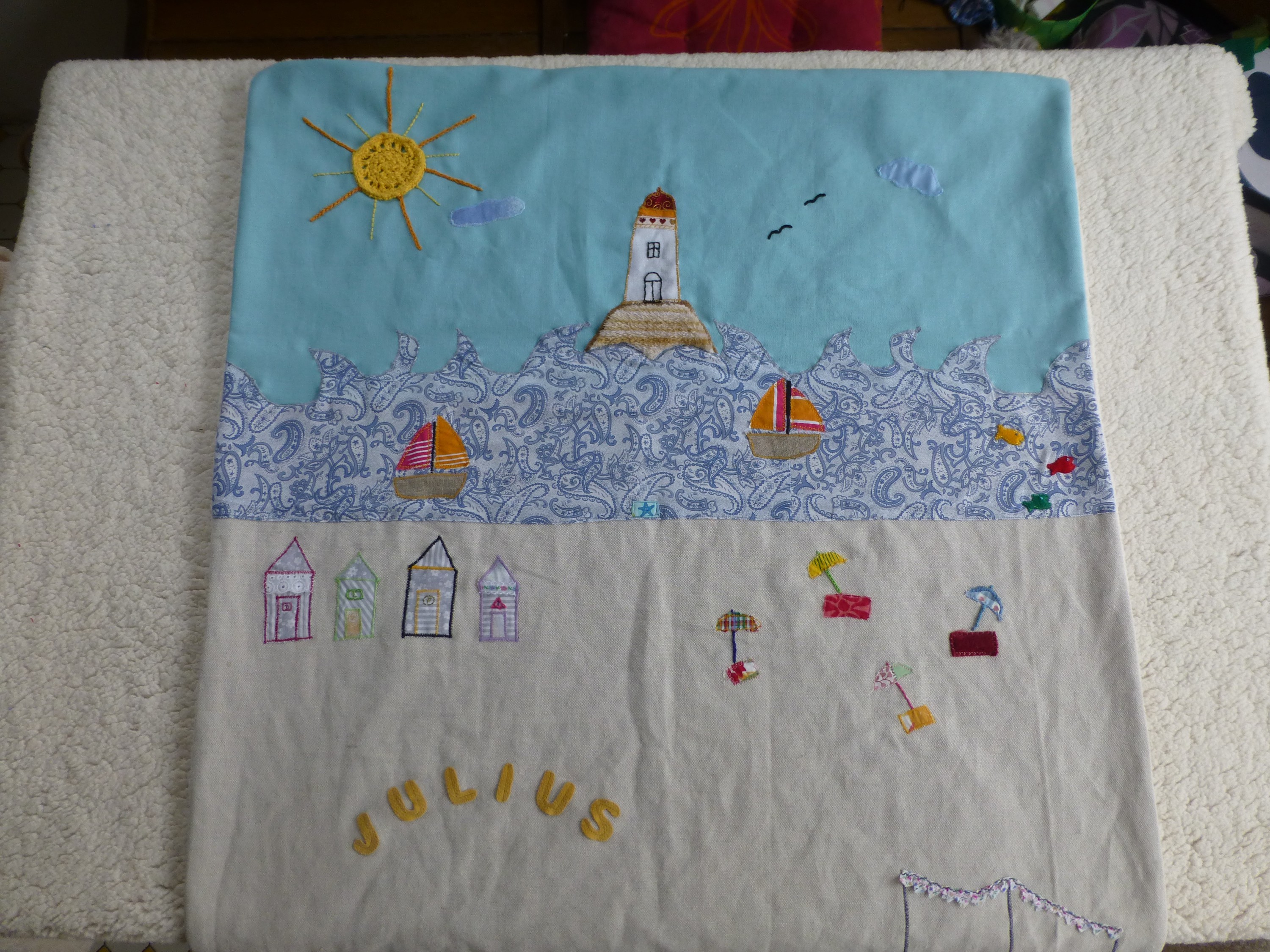 Diese Decke habe ich anläßlich der Geburt meines Neffens verschenkt. Die Rückseite besteht aus Teddyplüsch, polstert und wärmt gleichermaßen. Die Applikationen bieten jede Menge Abenteuer für kleine Entdeckerhände. Die Strandhäuschen tragen die Initialen der Vornamen der "Restfamilie".