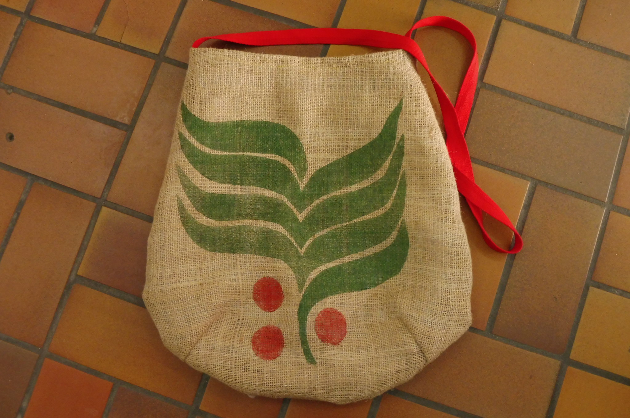 genäht aus einem Kaffeesack, gefüttert mit Baumwollstoff, innentasche mit RV Fach.