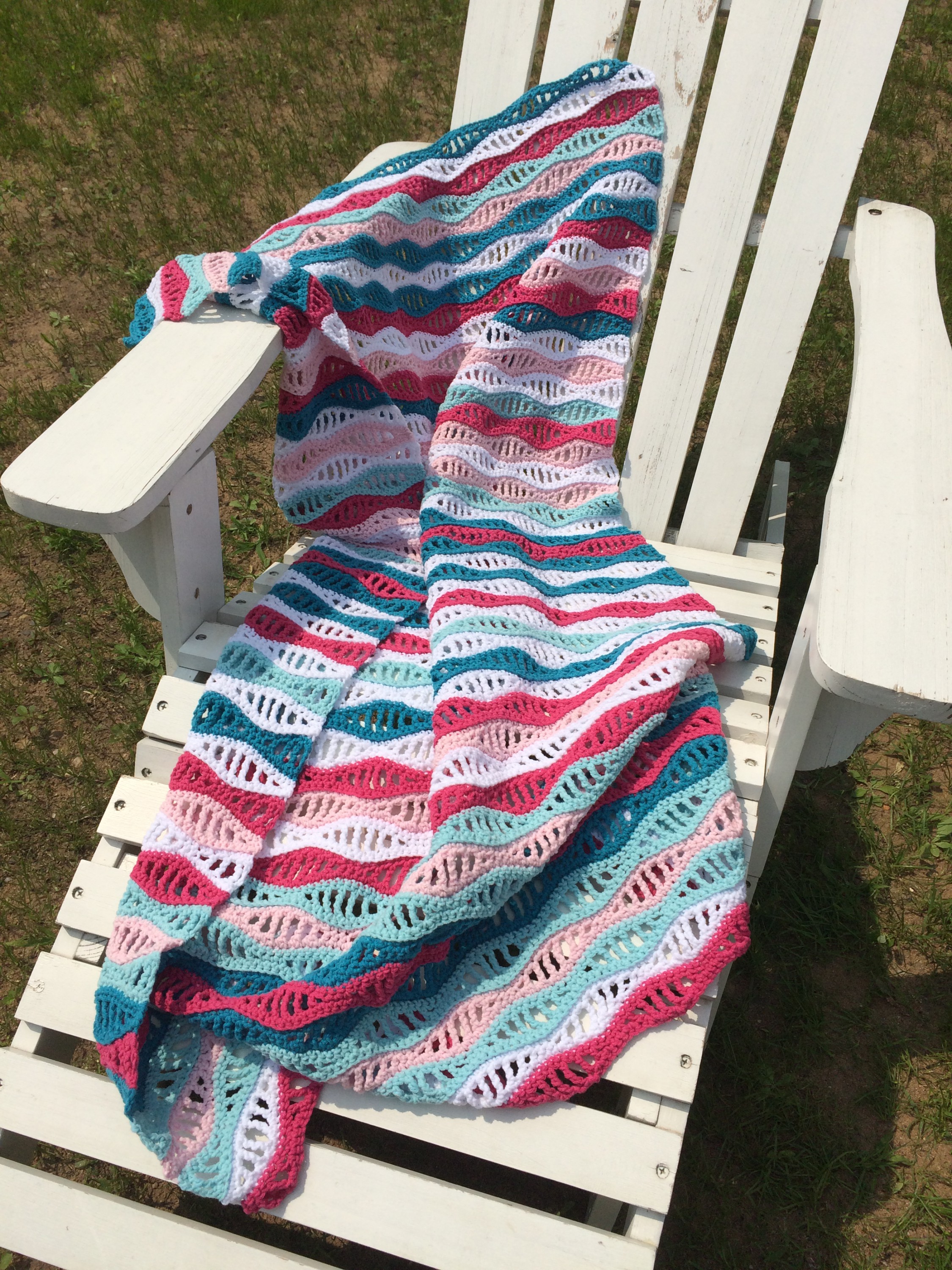 Gehäkelt nach der freien Anleitung von Elizzza (auf ihrer HP oder über YouTube) genannt Wellenmuster. Ich habe schon einmal nach diesem Muster eine Decke gehäkelt und solange man zählen kann, geht das auch recht flott von der Hand ![]()