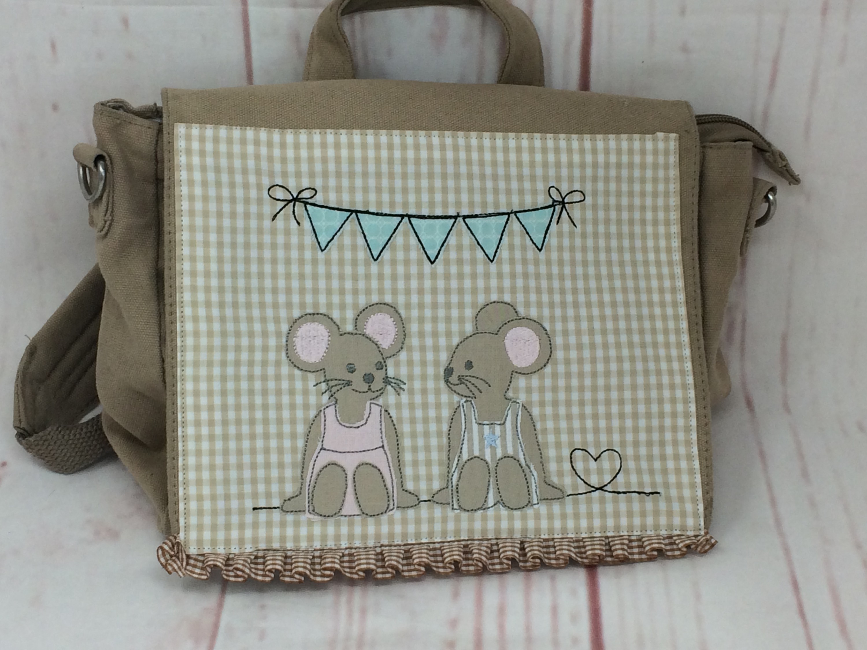 Die Stickmuster sind von Stick-Herz, das gibt es aber nicht fertig - ich habe mehrere Dateien miteinander kombiniert. Das Ganze dann in Form gebracht, dazu Faltenband und endlich ist das Prachtstück fertig.