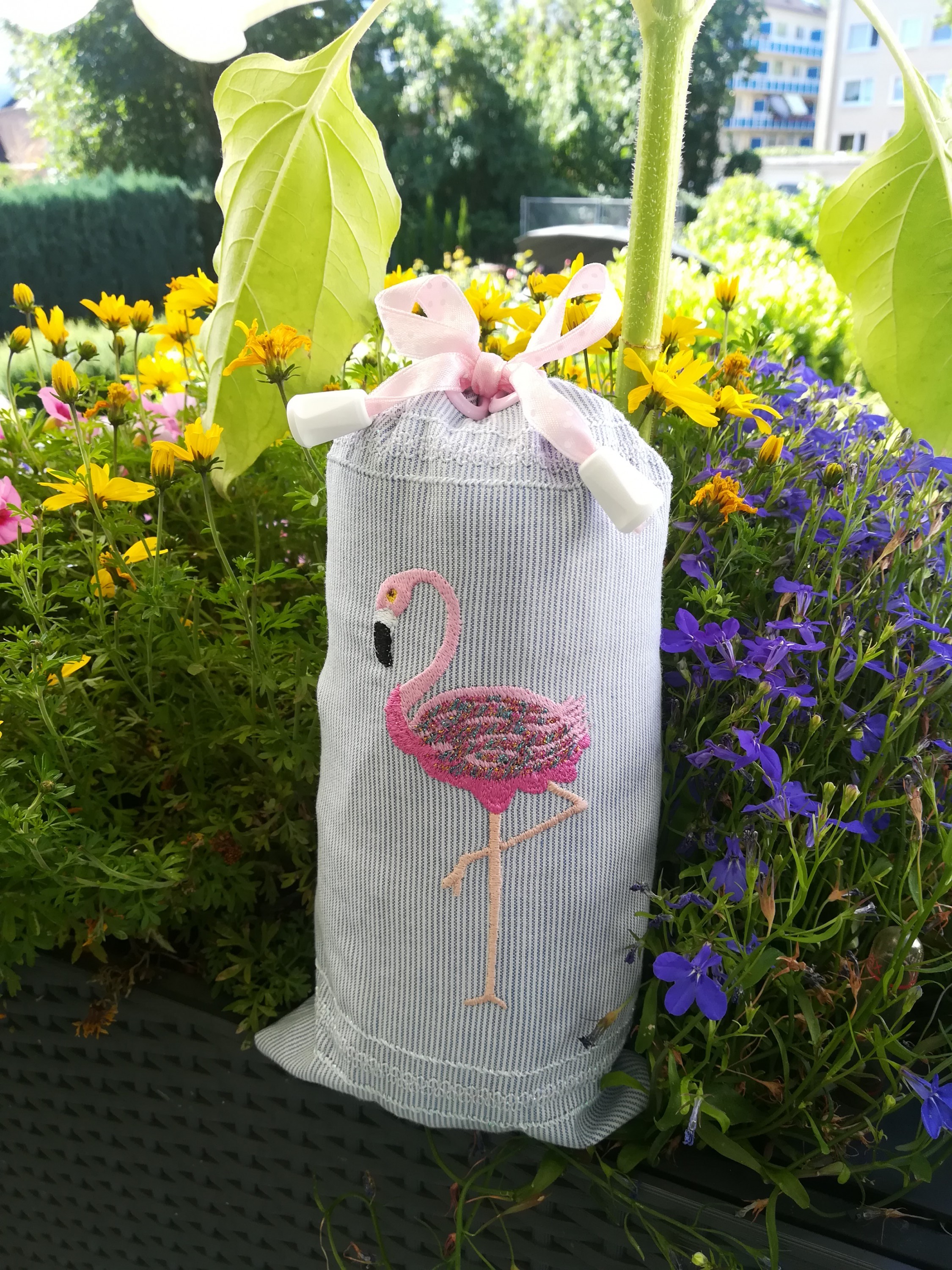 Damit sie gut geschützt mal mitgenommen werden kann und das Material nicht leidet, braucht sie einen Schutz. Den hat sie nun bekommen, bestickt mit meiner Stickdatei Flamingo Holly und genäht aus dünnem Baumwollstoff und verziert mit etwas Glamourgarn ist sie nun immer zur Stelle, wenn es mal drauf ankommt!