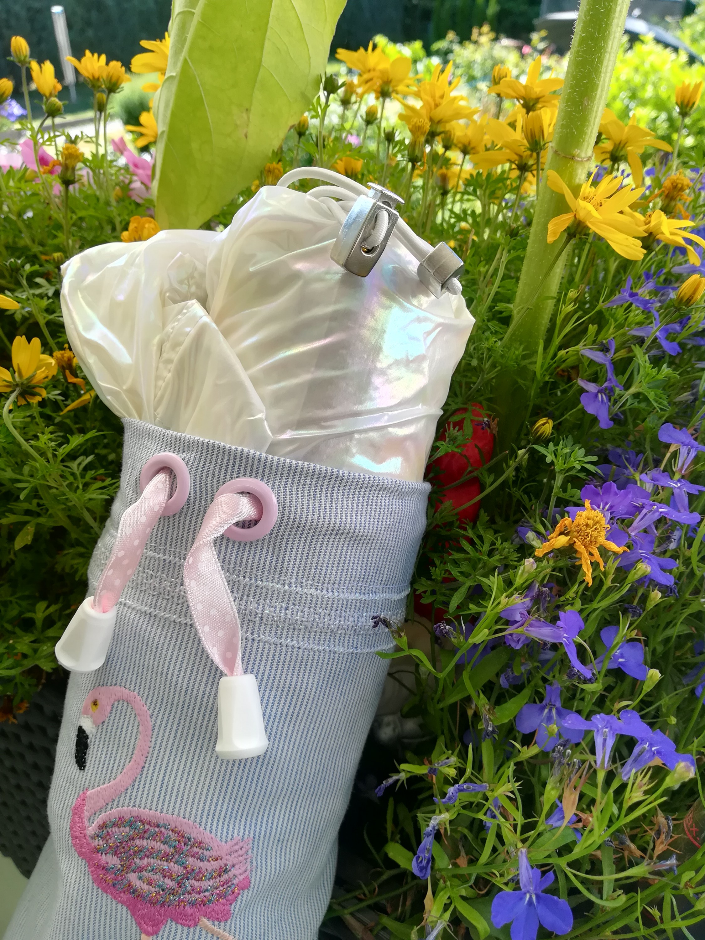 Damit sie gut geschützt mal mitgenommen werden kann und das Material nicht leidet, braucht sie einen Schutz. Den hat sie nun bekommen, bestickt mit meiner Stickdatei Flamingo Holly und genäht aus dünnem Baumwollstoff und verziert mit etwas Glamourgarn ist sie nun immer zur Stelle, wenn es mal drauf ankommt!