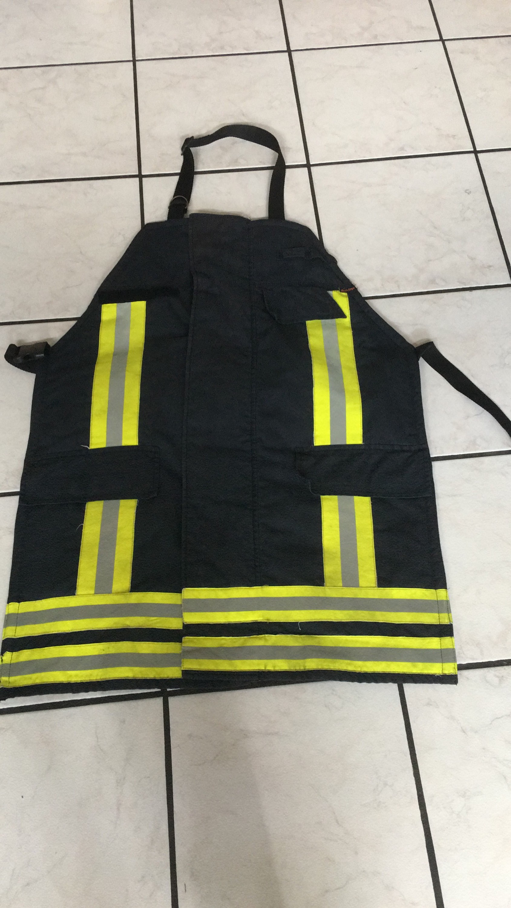Im Auftrag der Einheit meines Mannes ist als Geschenk diese Grillschürze aus einer ausgemusterten Brandeinsatzjacke entstanden .