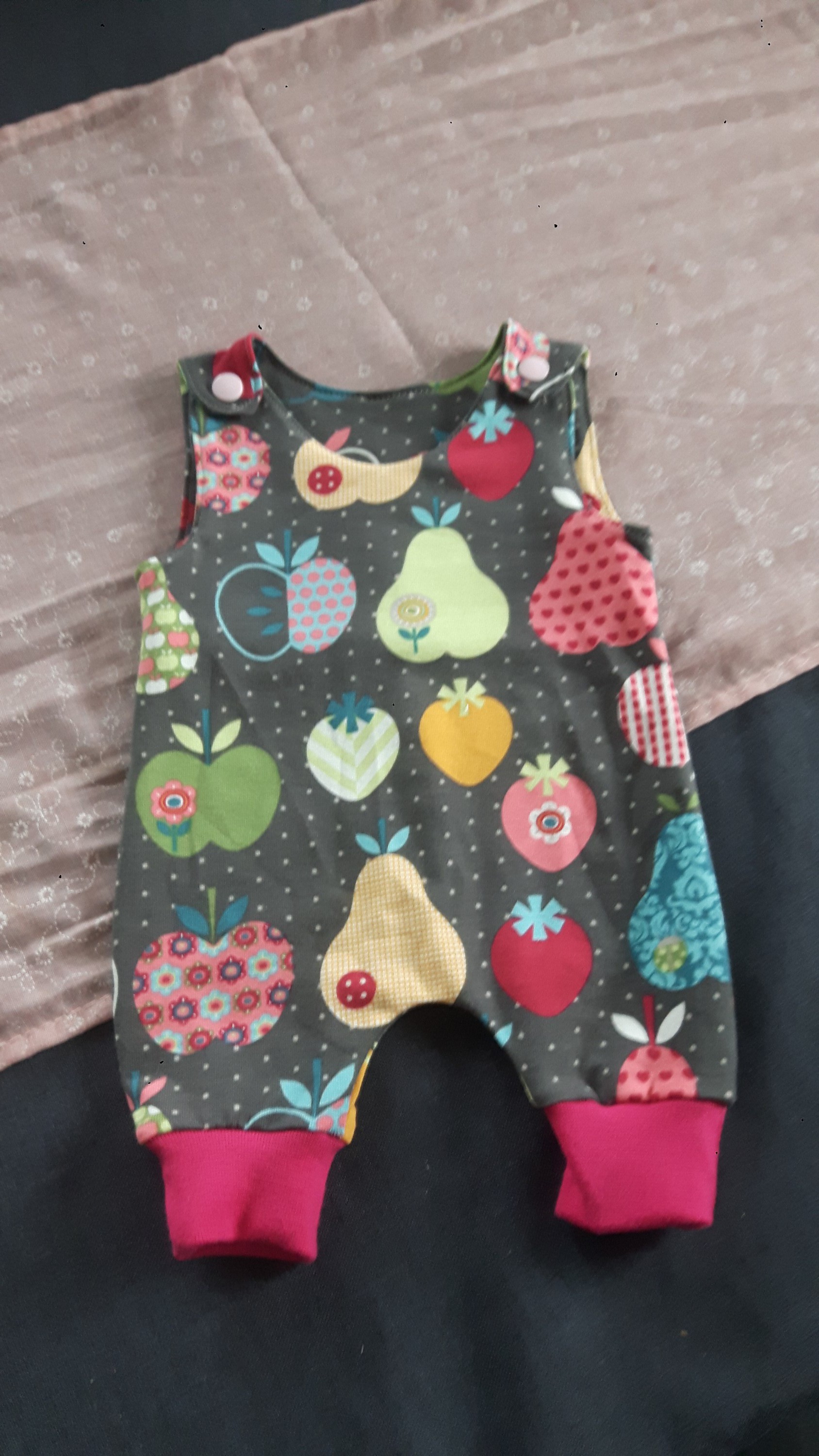 Meine Freundin hat gestern zwar ein reifes, dennoch winziges Mädchen entbunden, dem selbst die Sachen der großen Zwillingsbrüder, die ja auch durch Frühgeburtlichkeit mit 2500g klein waren, nicht passen. Daher habe ich heute früh Stoffreste herausgesucht und einen Strampler in Größe 44 auf die Schnelle genäht.