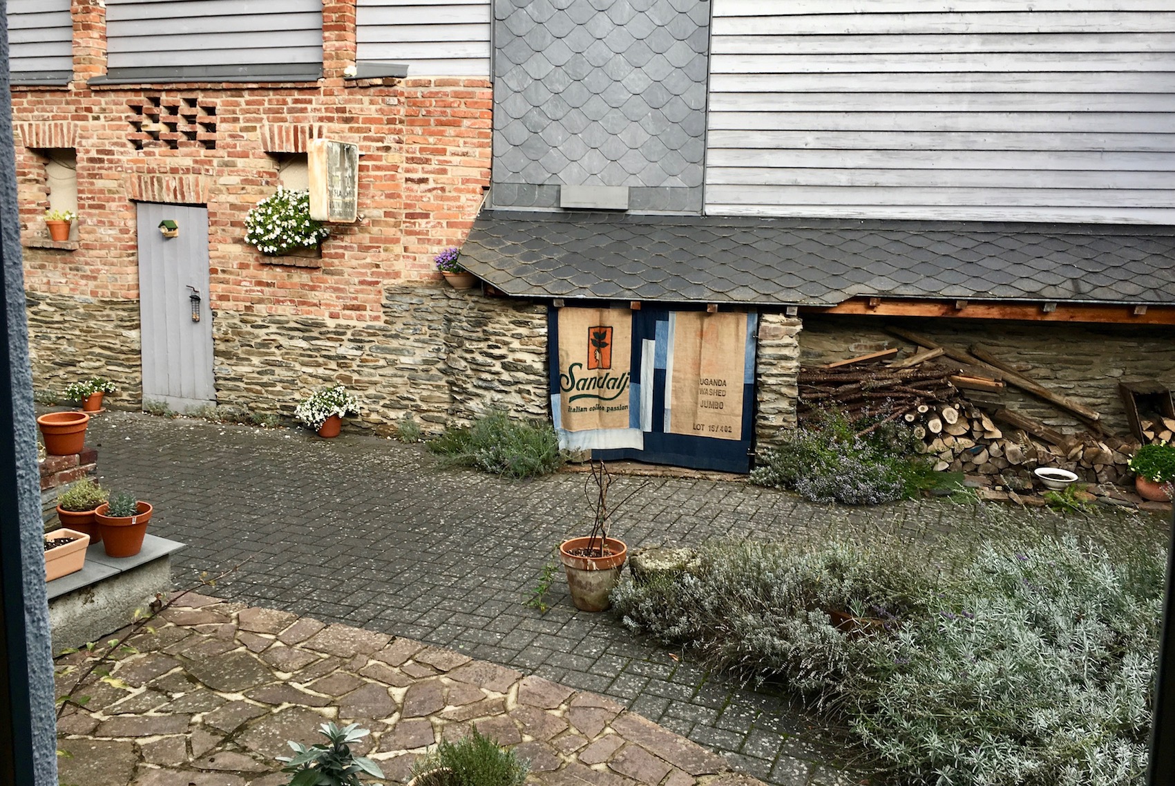 Der Kaffeesack-Vorhang nebst old jeans upcycling sorgt im Innenhof nun dafür, dass ich die Mülltonnen nicht mehr sehen muss.