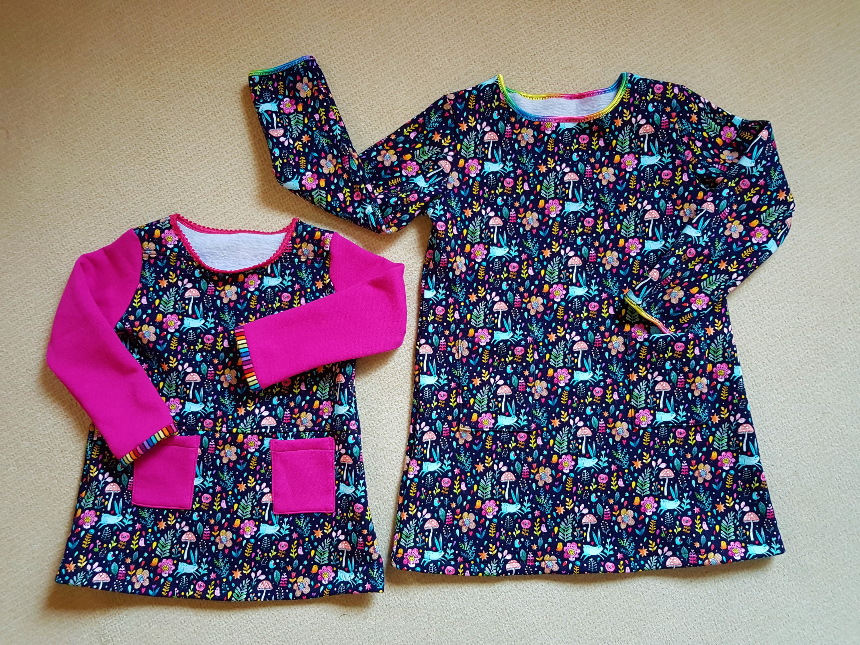 Mädchenkleider in den Größen 98 und 122 um ca. 2cm gekürzt, damit der Stoff reicht, nach dem Schnitt "Happy Rainy Days" aus der Ottobre 4/2017 genäht aus einem kuscheligen Sweatshirtstoff "Wald Tiere" von Gluenz. Das kleinere Kleid hat vorne über den Taschen eine Teilungsnaht und auch kurz unterhalb der Schulter rechts und links musste ich stückeln, weil der Stoff sonst nicht reichte. Aber ich habe es meistens mustergenau hinbekommen, genauso wie bei den Taschen des größeren Kleides, die man kaum sieht. ![]()