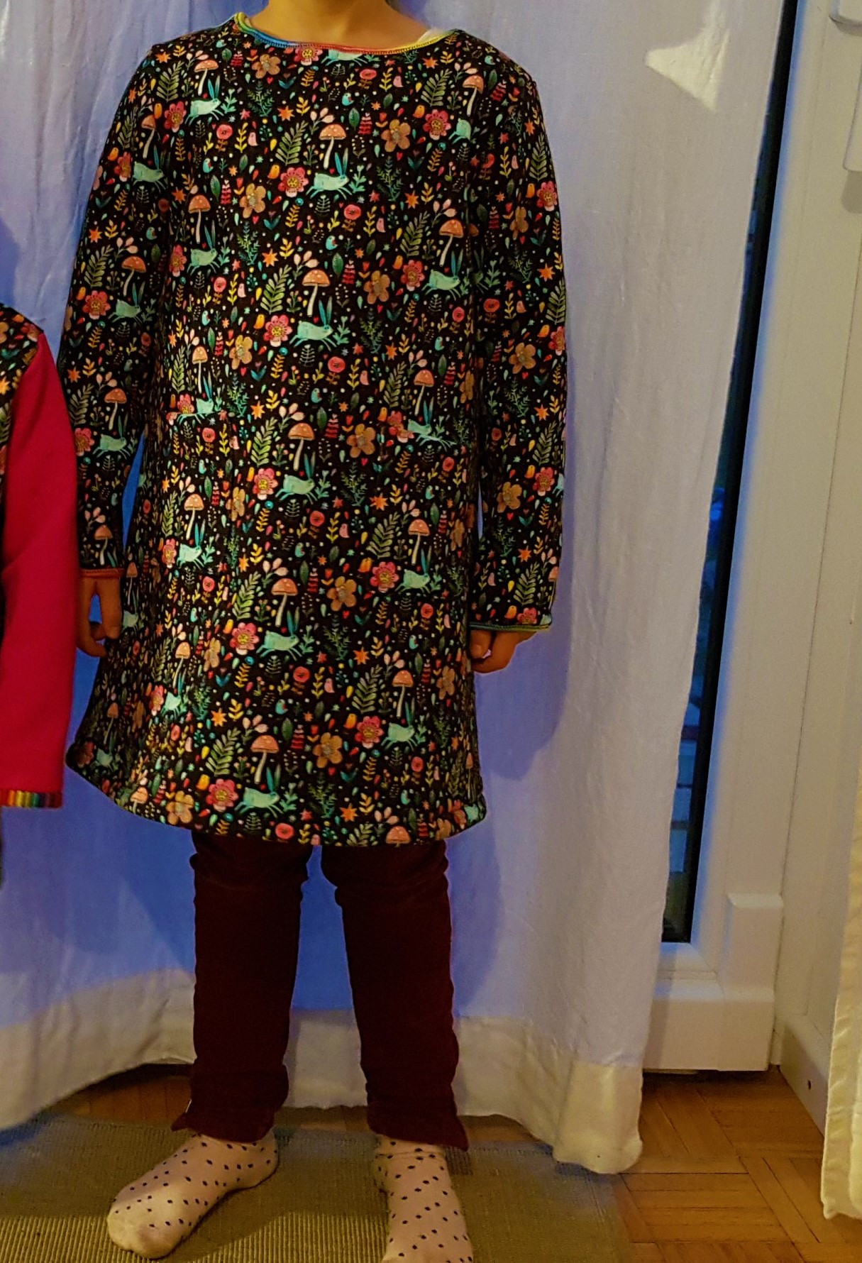Mädchenkleider in den Größen 98 und 122 um ca. 2cm gekürzt, damit der Stoff reicht, nach dem Schnitt "Happy Rainy Days" aus der Ottobre 4/2017 genäht aus einem kuscheligen Sweatshirtstoff "Wald Tiere" von Gluenz. Das kleinere Kleid hat vorne über den Taschen eine Teilungsnaht und auch kurz unterhalb der Schulter rechts und links musste ich stückeln, weil der Stoff sonst nicht reichte. Aber ich habe es meistens mustergenau hinbekommen, genauso wie bei den Taschen des größeren Kleides, die man kaum sieht. ![]()