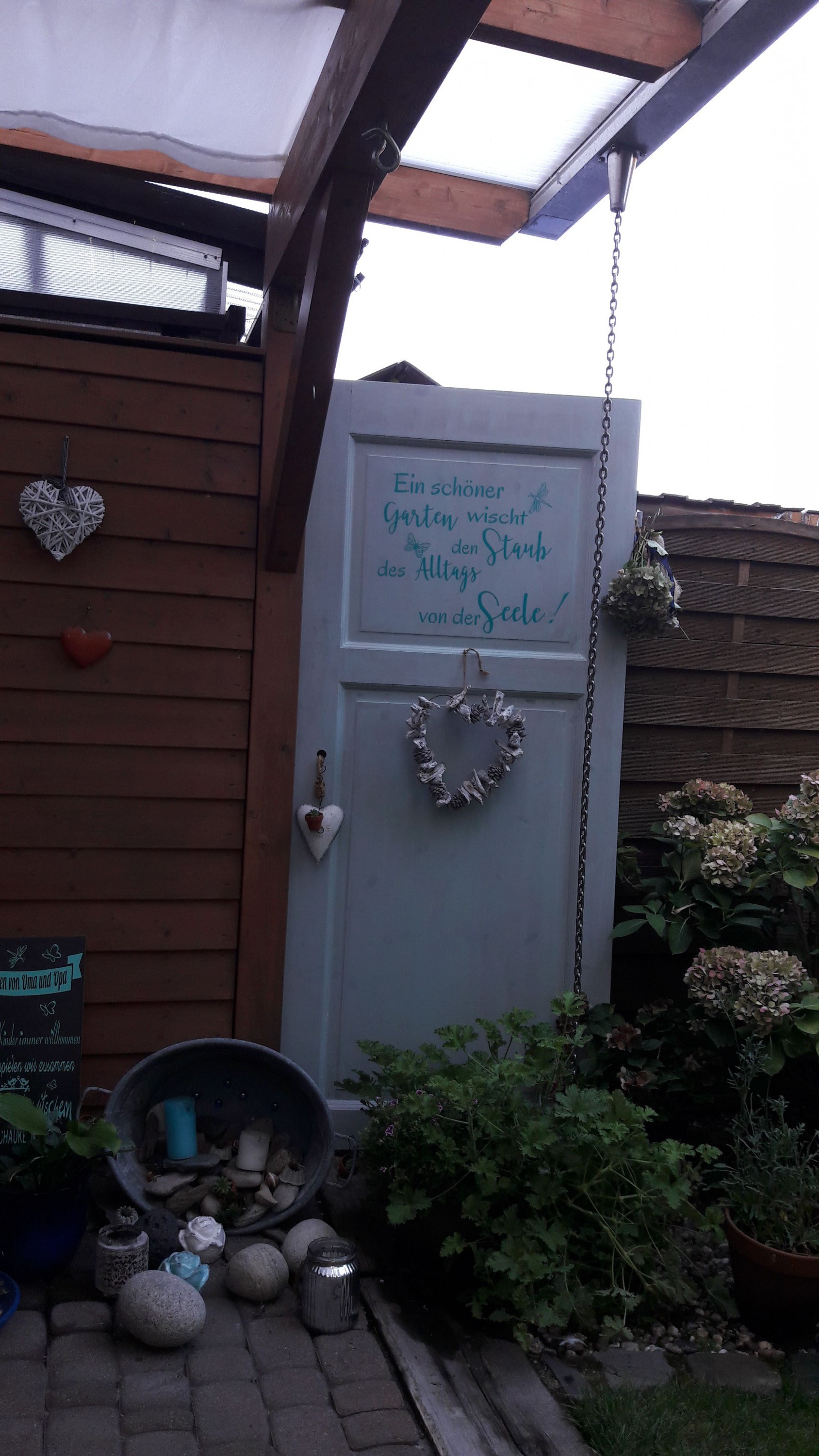 Da unsere Nachbarn ihen Zaun hässlich geflickt hatten, kam eine alte Tür wieder zu Ehren. Gestrichen mit blue wash Farbe. Geplottete Motive aus Vinylfolie.