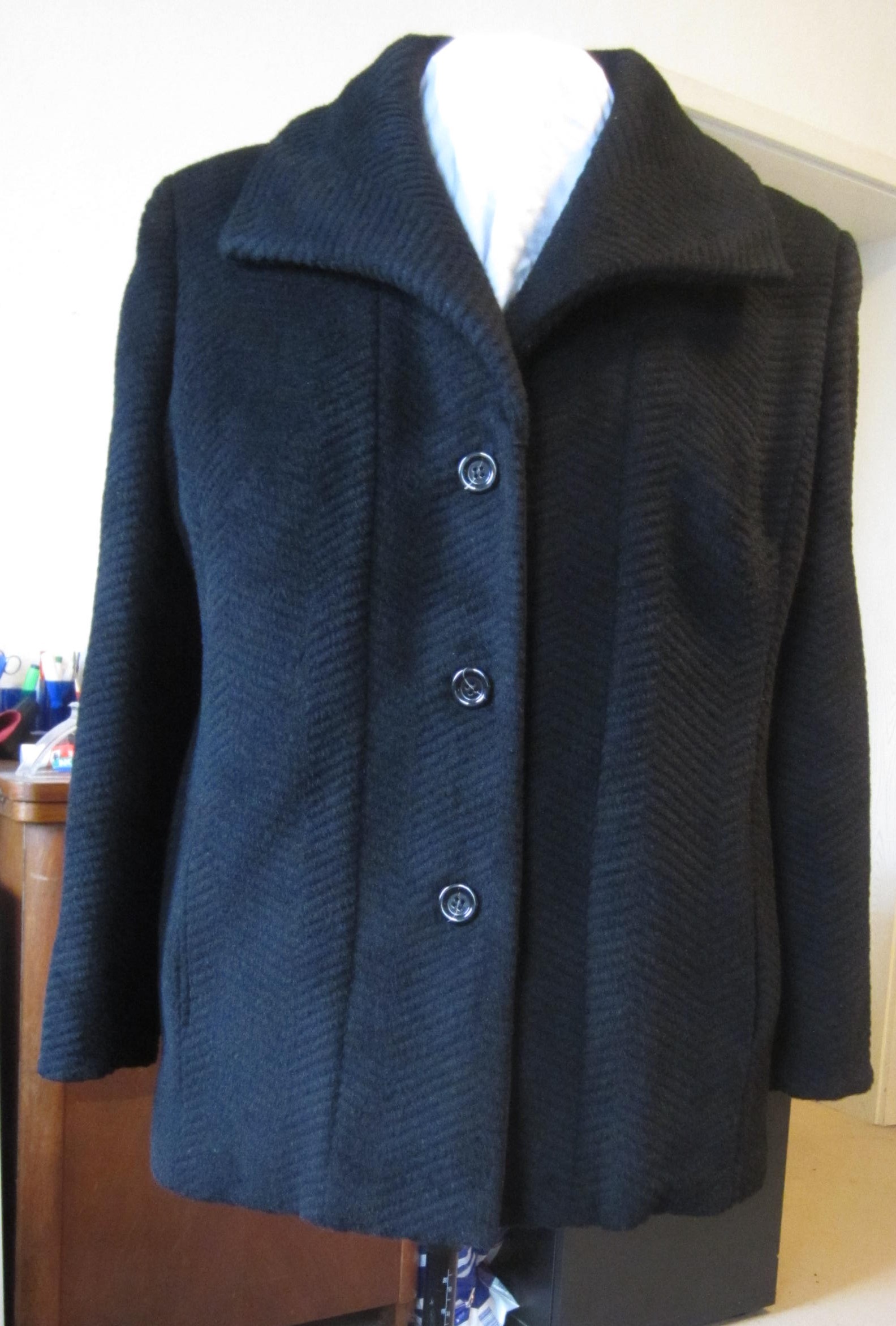(mit aufpikierter Rosshaareinlage, Reinseidenorganza als Krageneinlage, Paspelknopflöchern und Innentasche.)