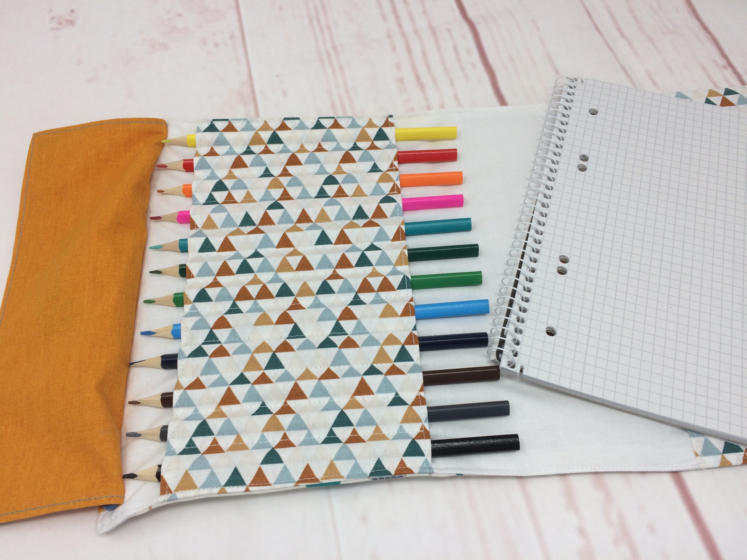 Hier kann man die linke Seite sehen: die Stifte passen in die aufgenähten Plätze, gehalten werden sie durch die Klappe, damit sie unterwegs nicht herausfallen können.
