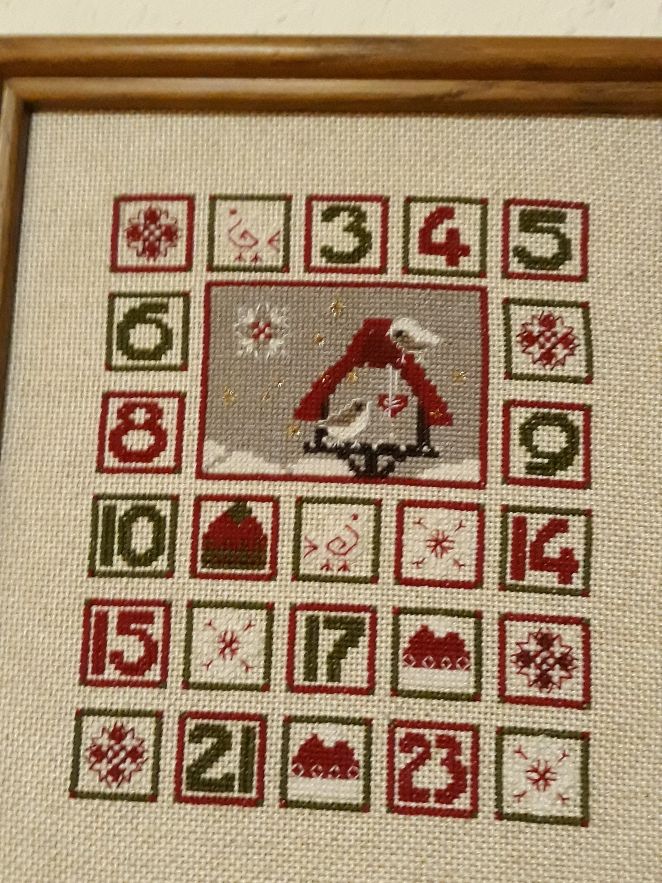 Mein gestickter Adventskalender, den ich kurz vor der letzten Adventszeit noch einrahmen konnte. Nun sollte er mal langsam von der Wand, wird bald Ostern...